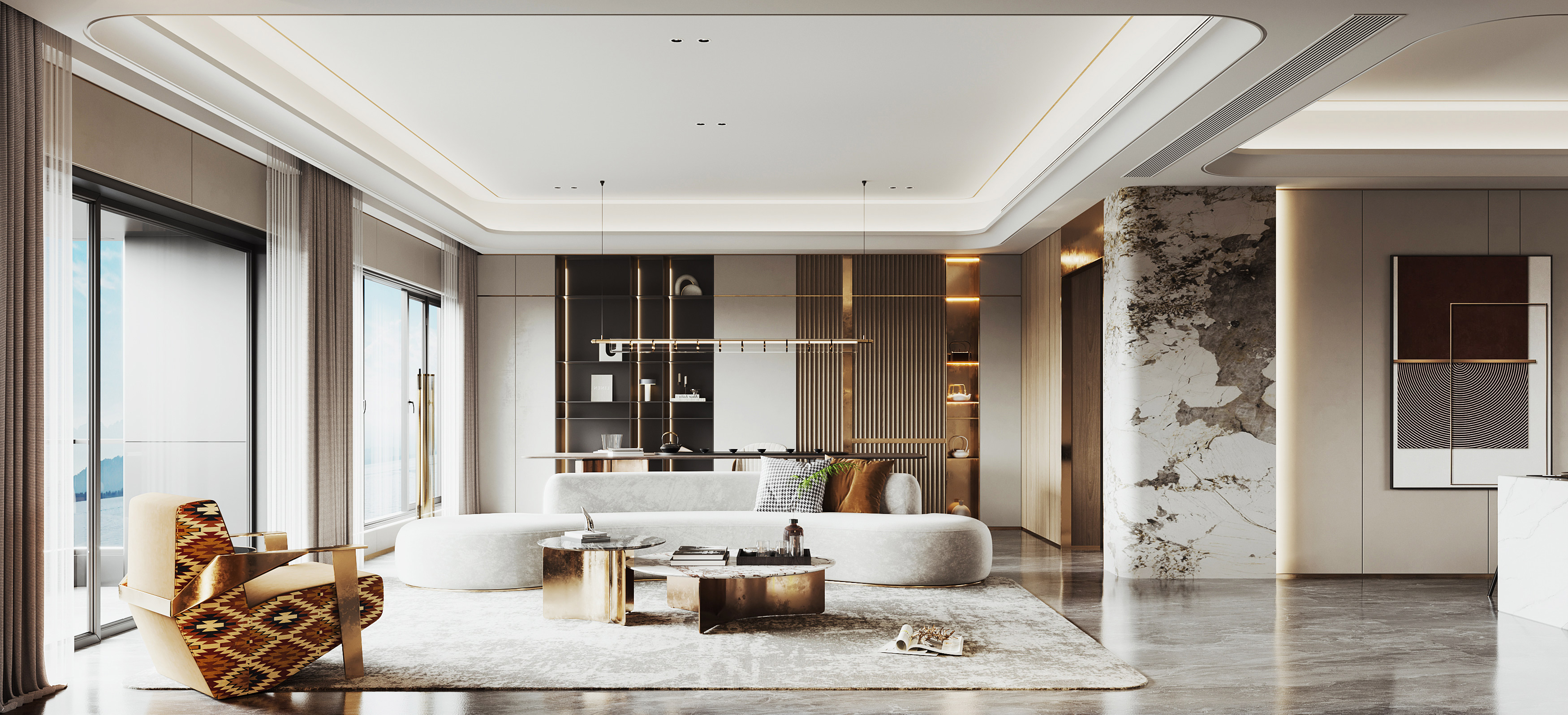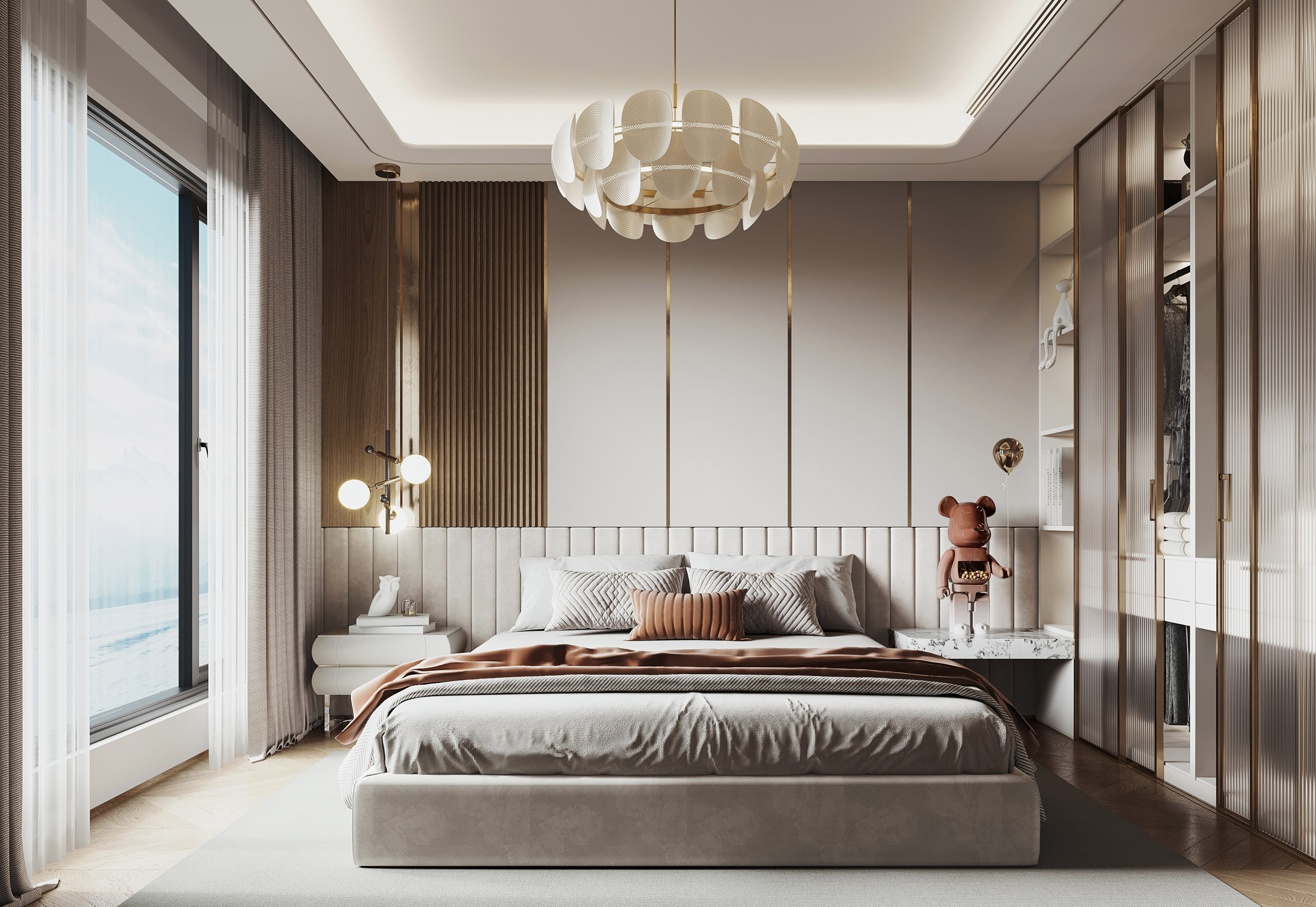 The opulent master bedroom is a showpiece of refined elegance and luxurious comfort. The room is adorned with lavish textures and finishes, such as sumptuous silk draperies and shallow but plush carpets. The fluted wooden and marbled walls are finished in soft color, providing a perfect backdrop for the ornate pendant light and floor lamp.