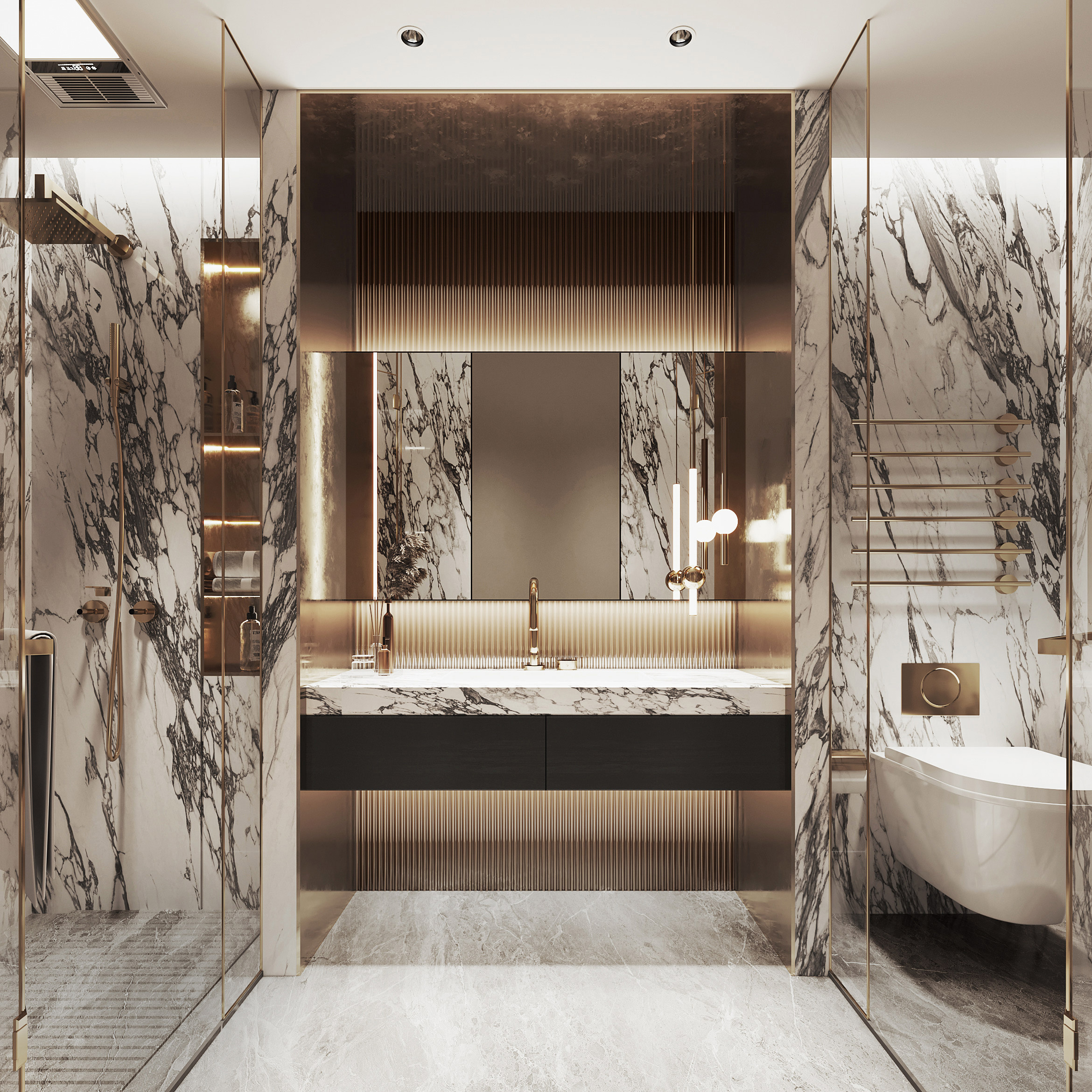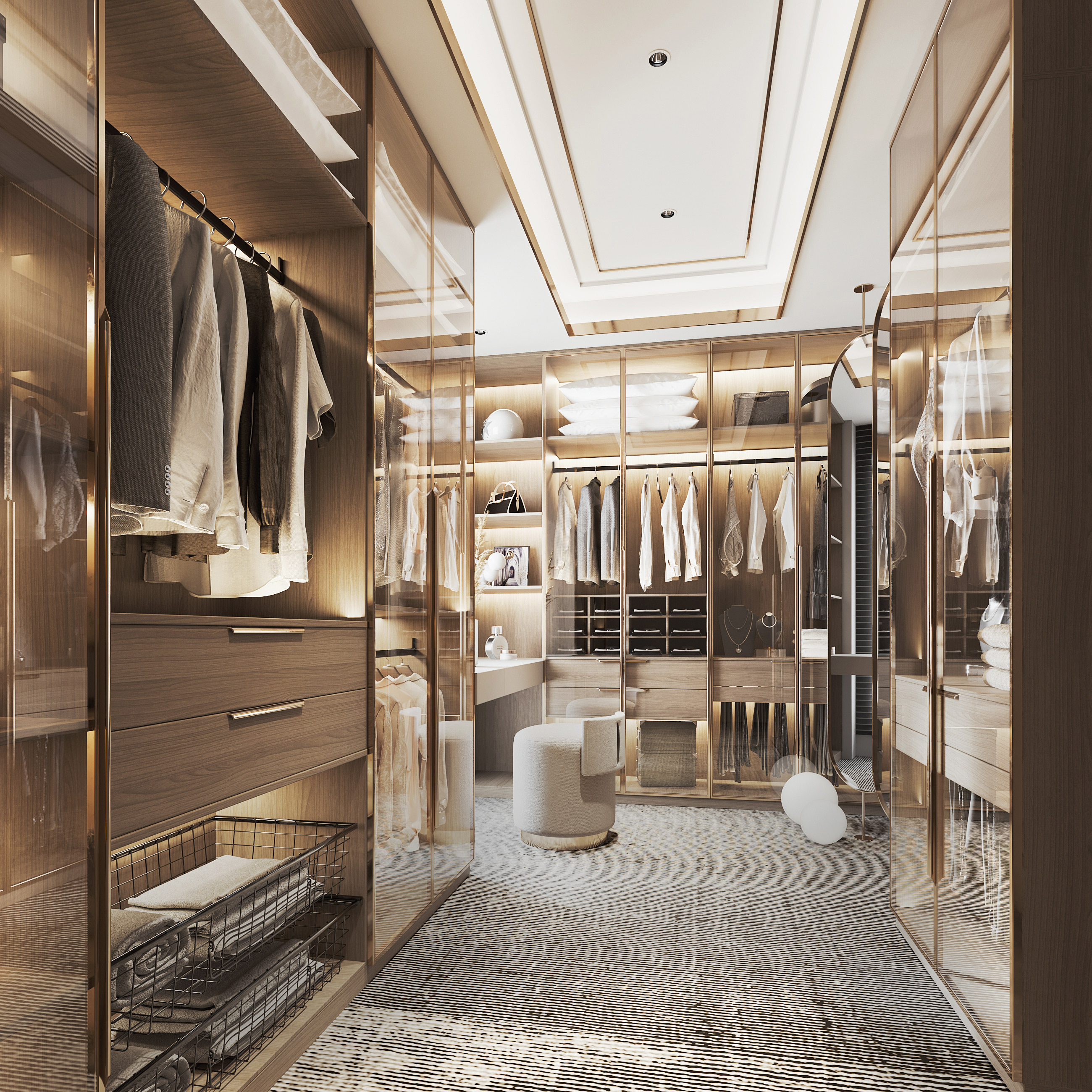 The huge shelf at the back is the key storage solution of this bedroom. Its facet combined by marble, wood slats and matt panels ingeniously adds a sophisticated look with layers to the room. Its sliding door provides easy access to the contents while keeping them out of sight when needed, makes display and uncluttering concurrently possible.