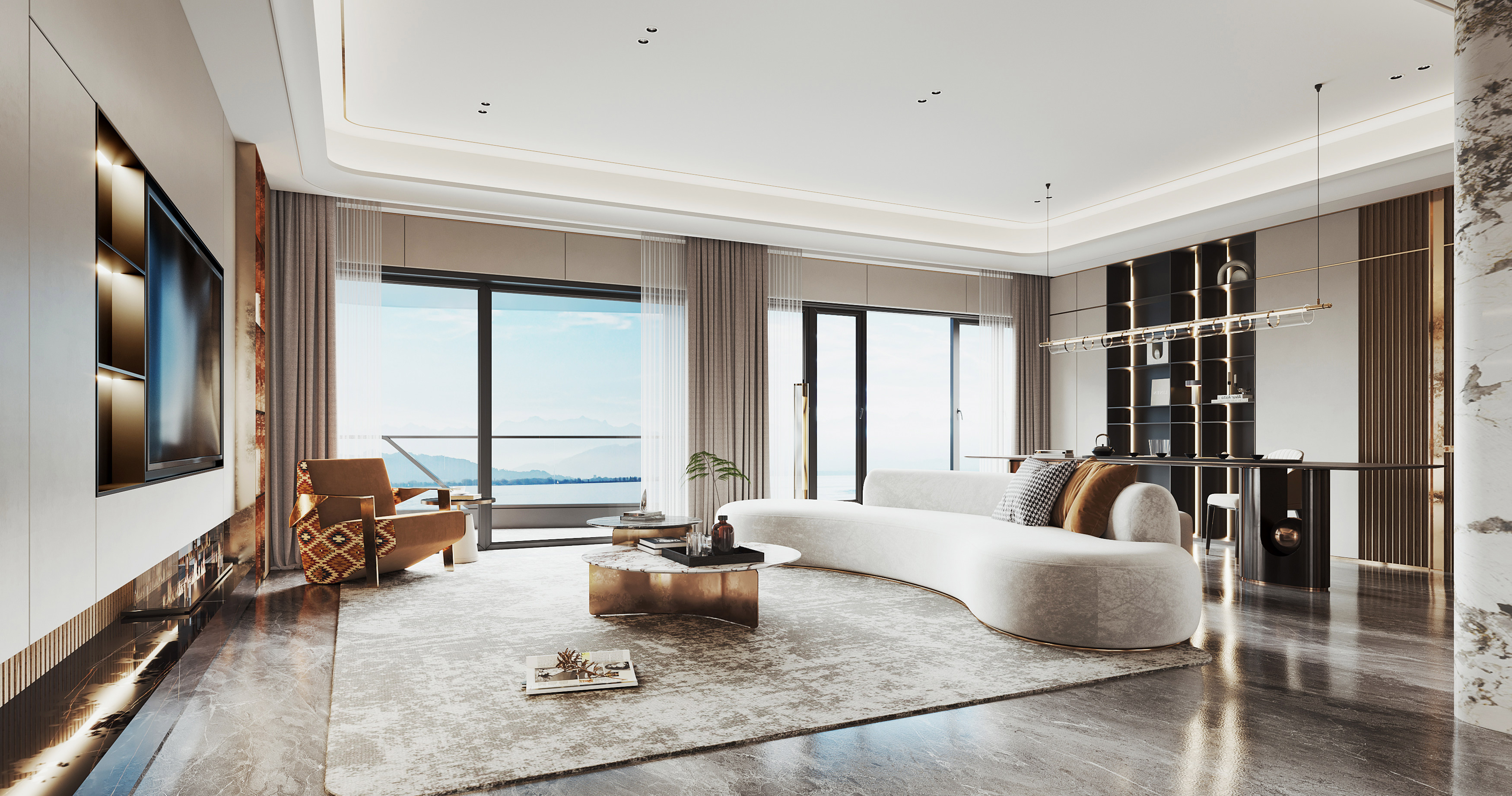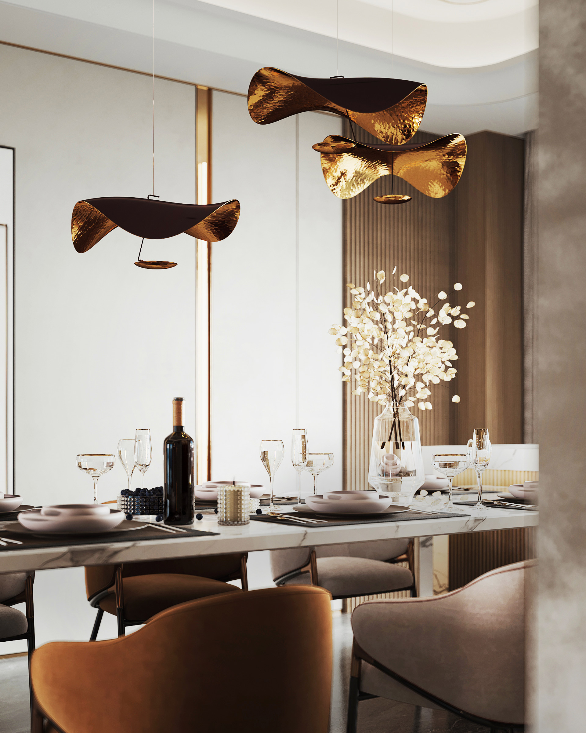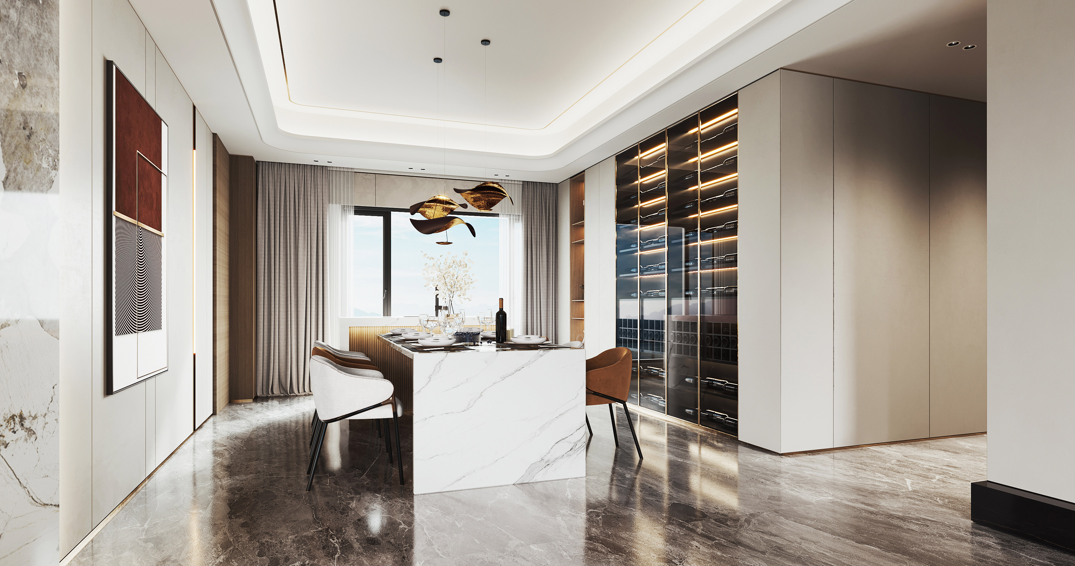 Taking advantage of the large floor span, a full-height wine cellar is a beautiful and elegant addition to the home, as there is nothing better than a wine cellar as a great conversation starter when entertaining guests. A rectangular marble dining table easily creates an expansive and welcoming space in this living room. It is further paired up with fabric chairs in whisky and champagne-toned velvet. The mix-and-match textures create a play on contrasts and soften the room for a relaxed yet opulent touch. The handcrafted wing-like pendant lights that glow golden lights at the centre of the seaview dining room wrap up the design aspiration from the owners - “Glow in Transcendence”.