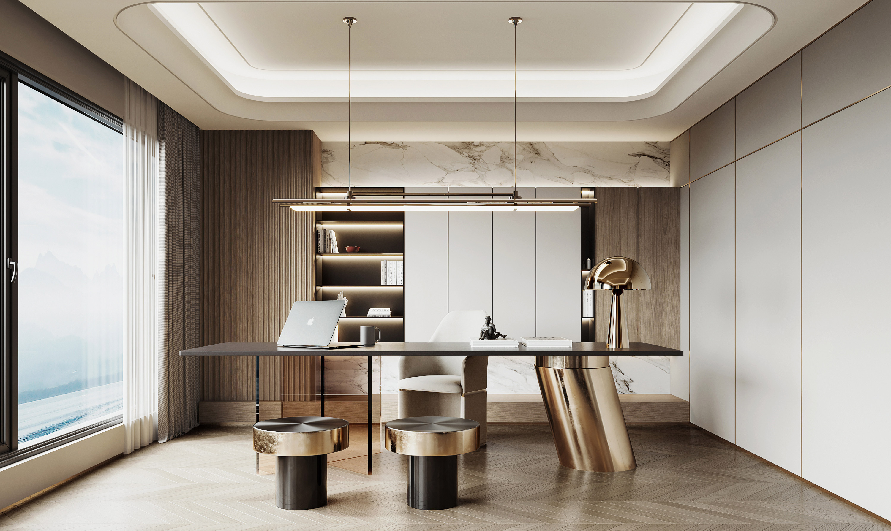 A well-designed work area could be a haven for productivity and relaxation. A energetic yet soothing ambience is created here by utilising abundant natural light from the huge full-height window. The working desk opposite the bed is a statement piece that brings a touch of glamour. The desk with a transparent leg practically allows room for stretching both legs and inspiration, while the softening chic look of its sleek metallic pedestal leg and the round stools complements the bedroom’s overall aesthetics.