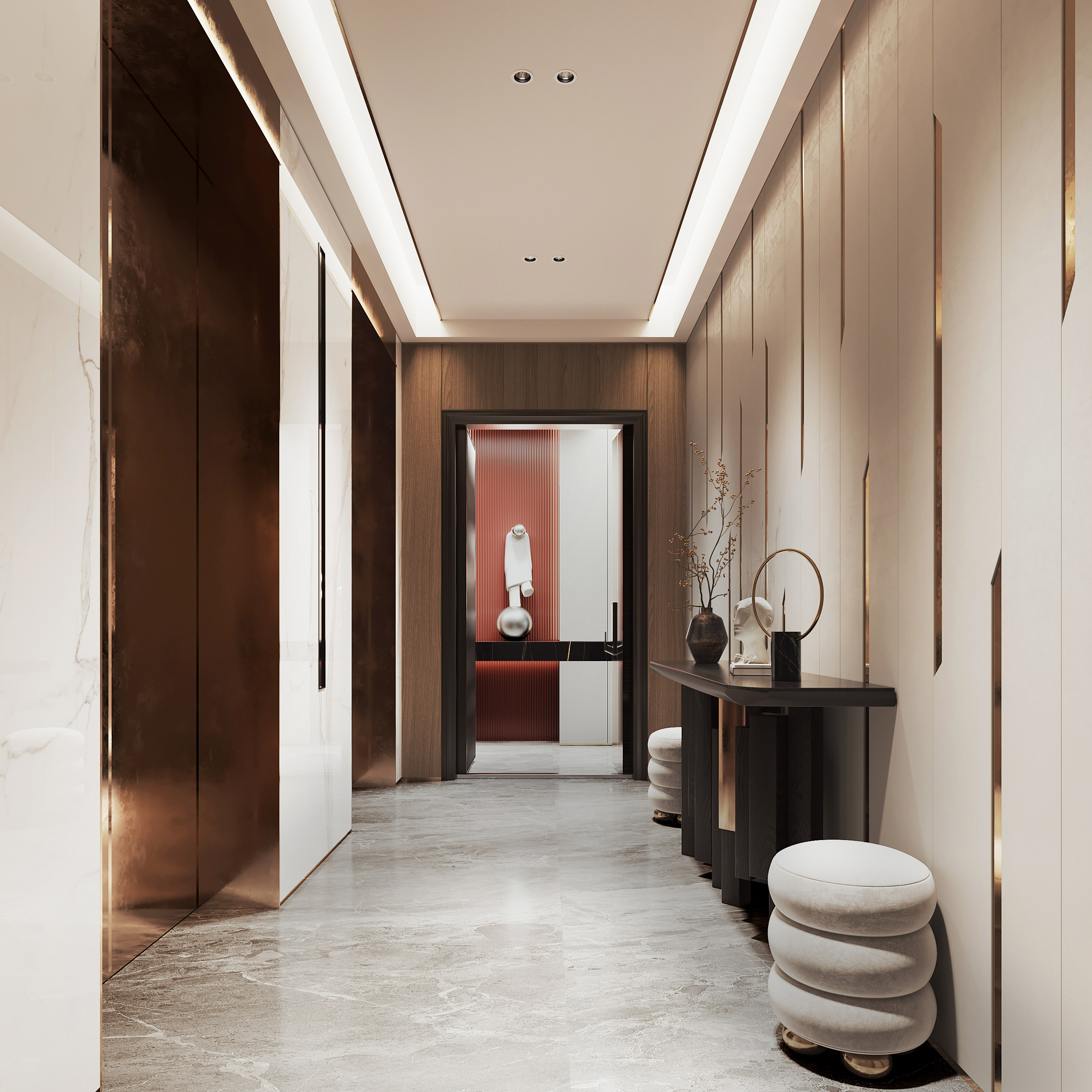 Inspired by luxurious boutique hotels, this private lift lobby design is all about cosy grandeur. The privileged club-members-only feeling is derived from the luxurious features, including but not limited to the grand ceiling lighting, warm colour palette, marbled floor, elegant console topped up with art pieces and stylish lounge seating.