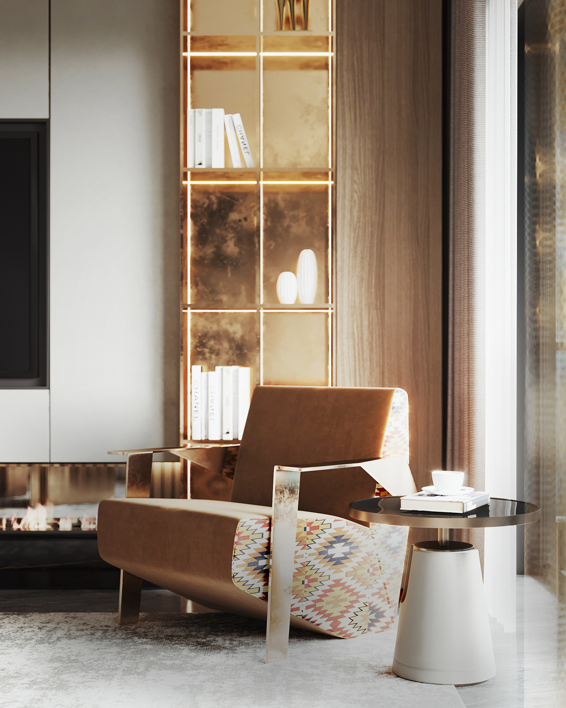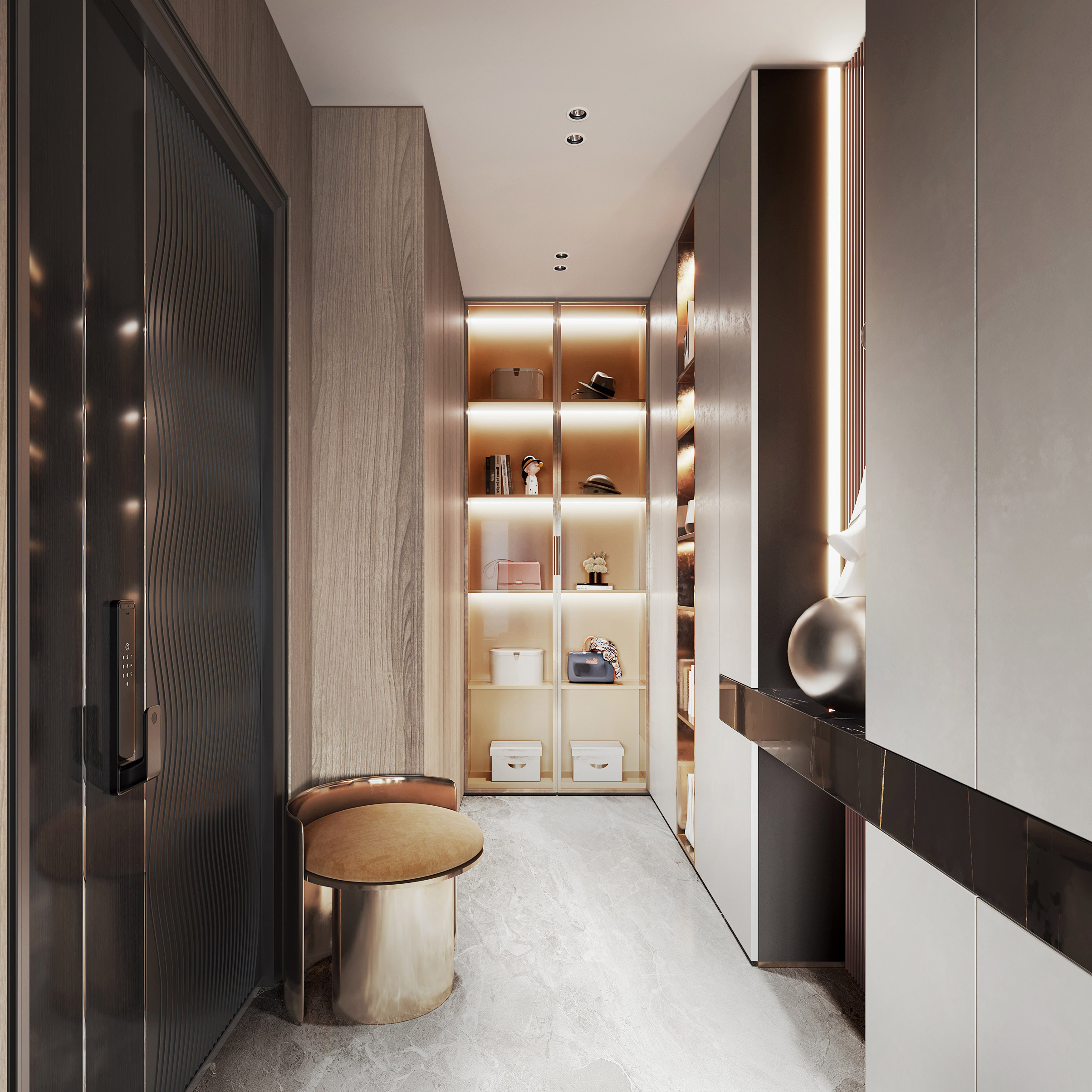 The sense of glamour continues in the foyer. The eye-catching display cabinet emulates the boutique feel of a 5-star hotel to wow the guests. It can showcase a beloved vintage handbag or a horse racing trophy - anything that celebrates life achievement on one’s own or with friends! Though natural light is absent, the embedded LED lighting strips in the cabinet and the wall brighten up the entire area. The lights also give a sense of atmosphere and leaving no displays being overlooked. The polished dark wood door, marbled floor, glass cabinet door, brass metal chair and oak wooden paneling orchestrate seamlessly, yet homely.