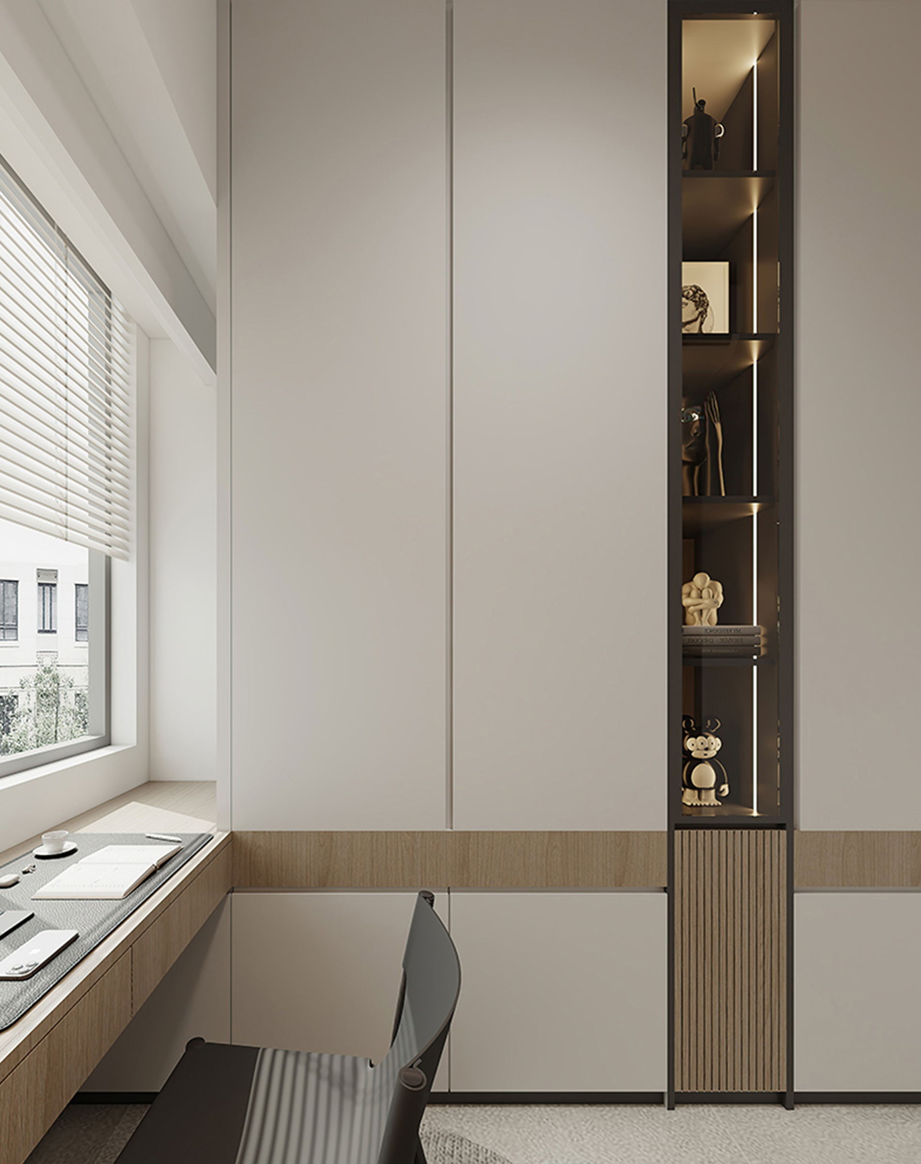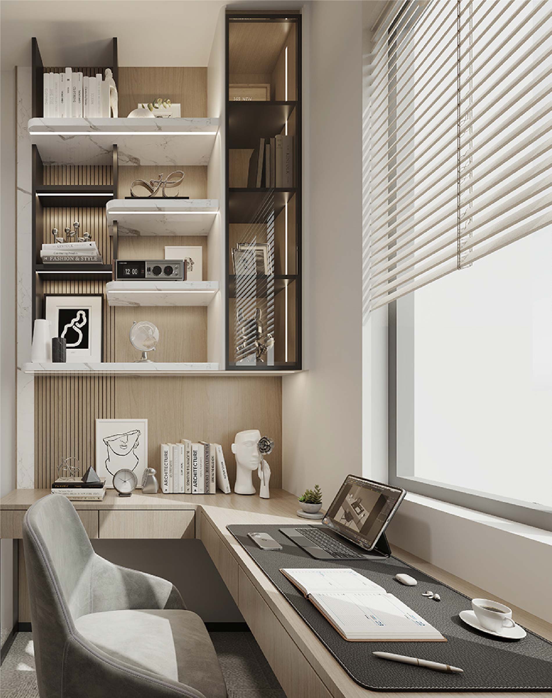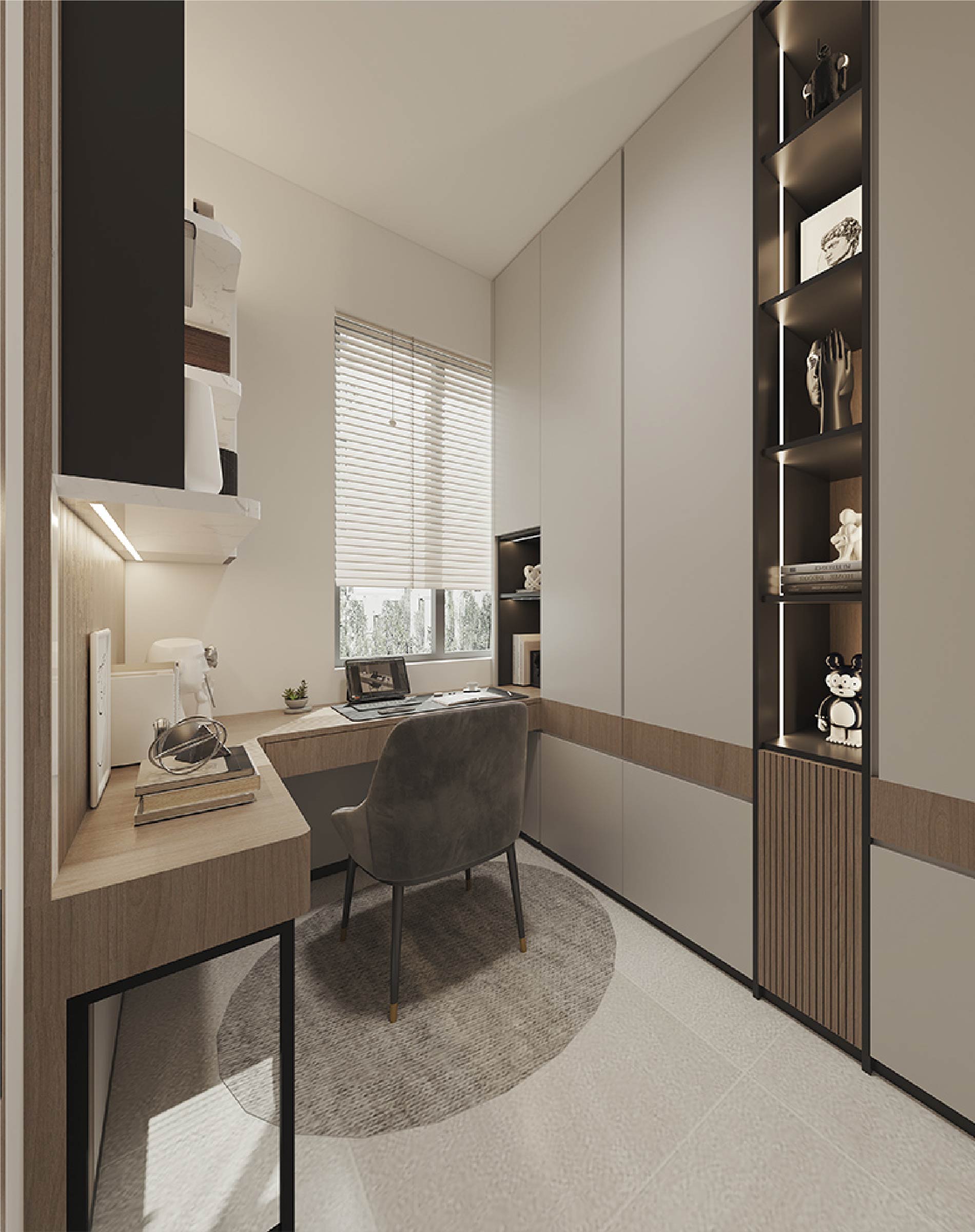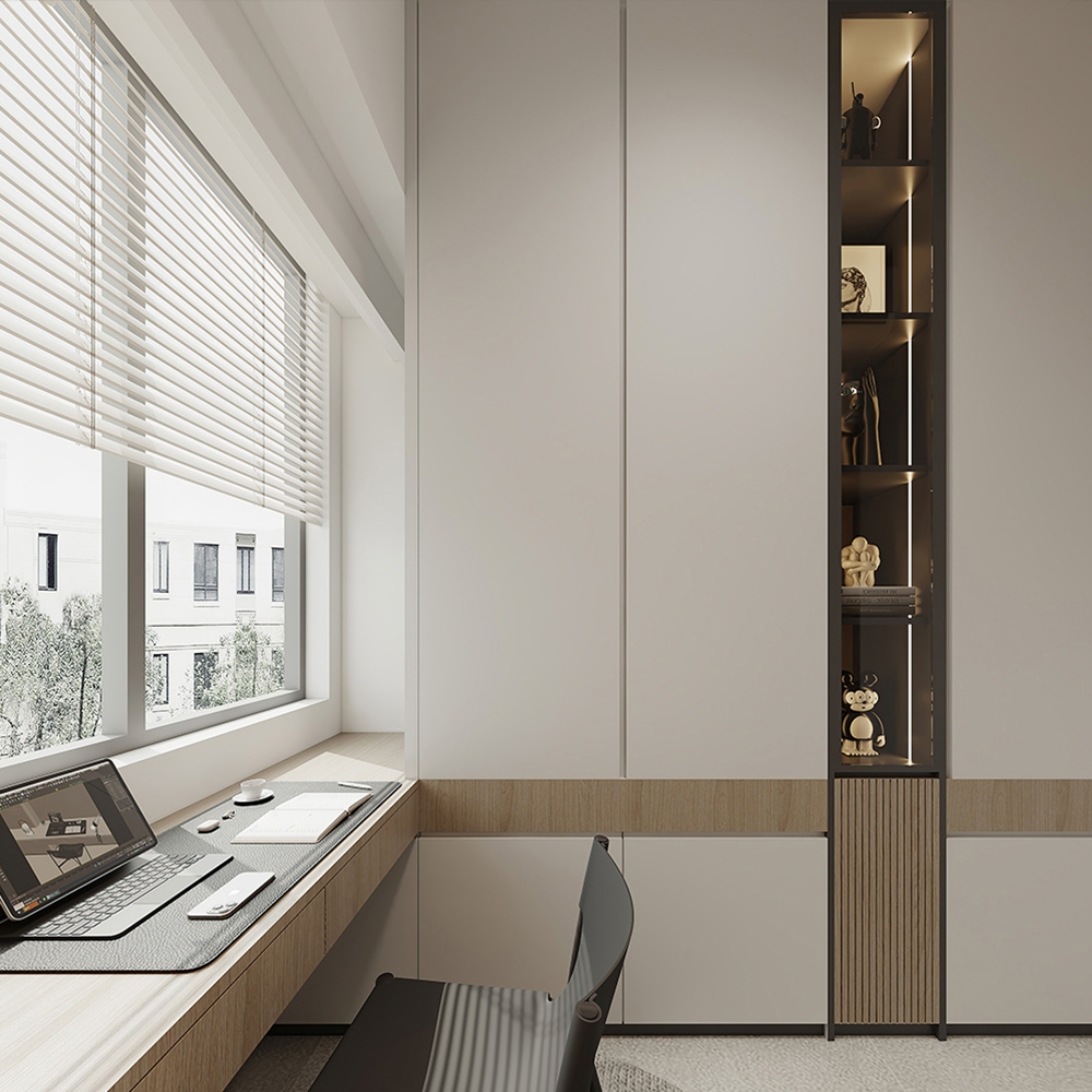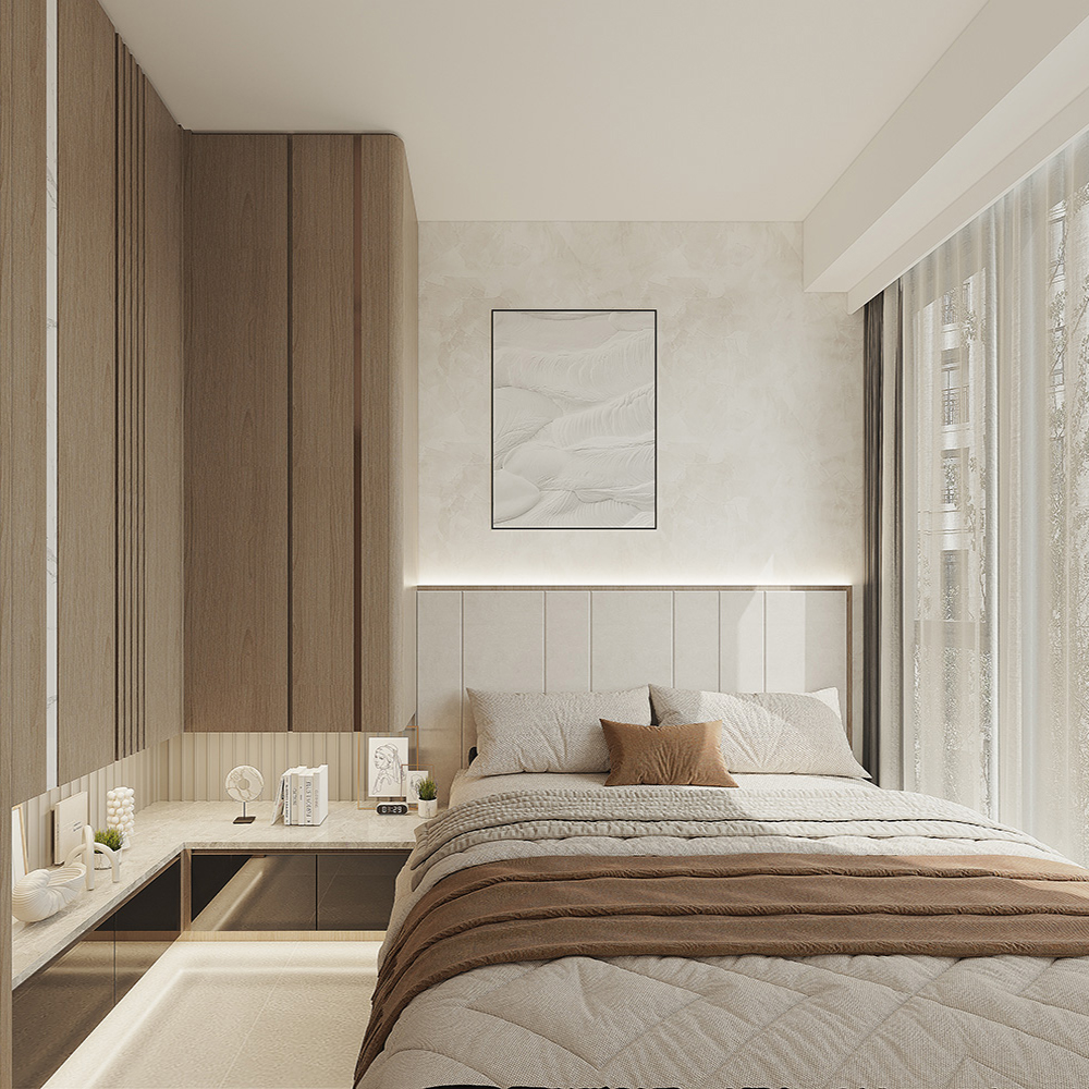 To replicate the bedroom's tranquil ambience, a soft and neutral colour palette sets the tone for the study area, creating a backdrop conducive to focus and relaxation. Furnished with clean-lined and cozy pieces such as a spacious desk and elevated bookshelves, the study area ensures a productive workspace.