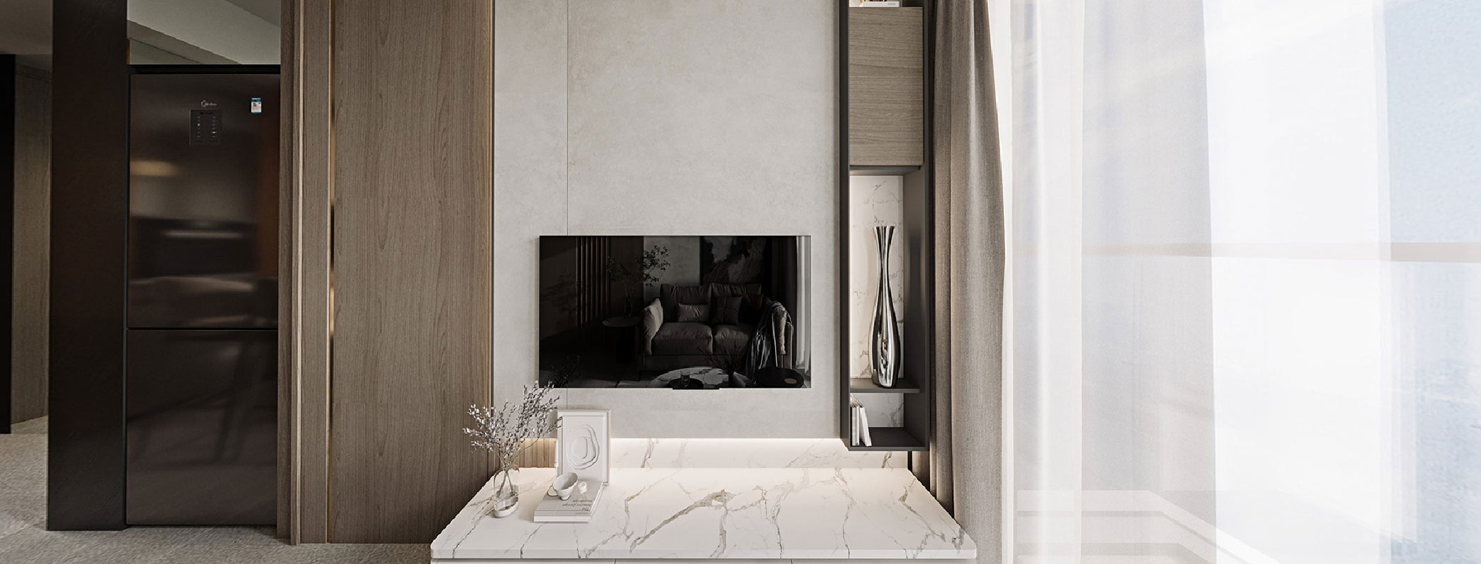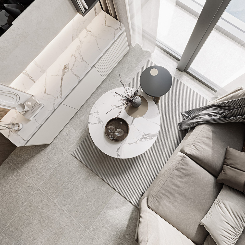 Materials and textures play a key role in bringing the concept of simple luxury to fruition. The wall covering in the living room mimics an artistic finish at a fraction of the cost, while the TV wall features ceramic tiles with a cement texture, perfectly complementing the modern aesthetics.