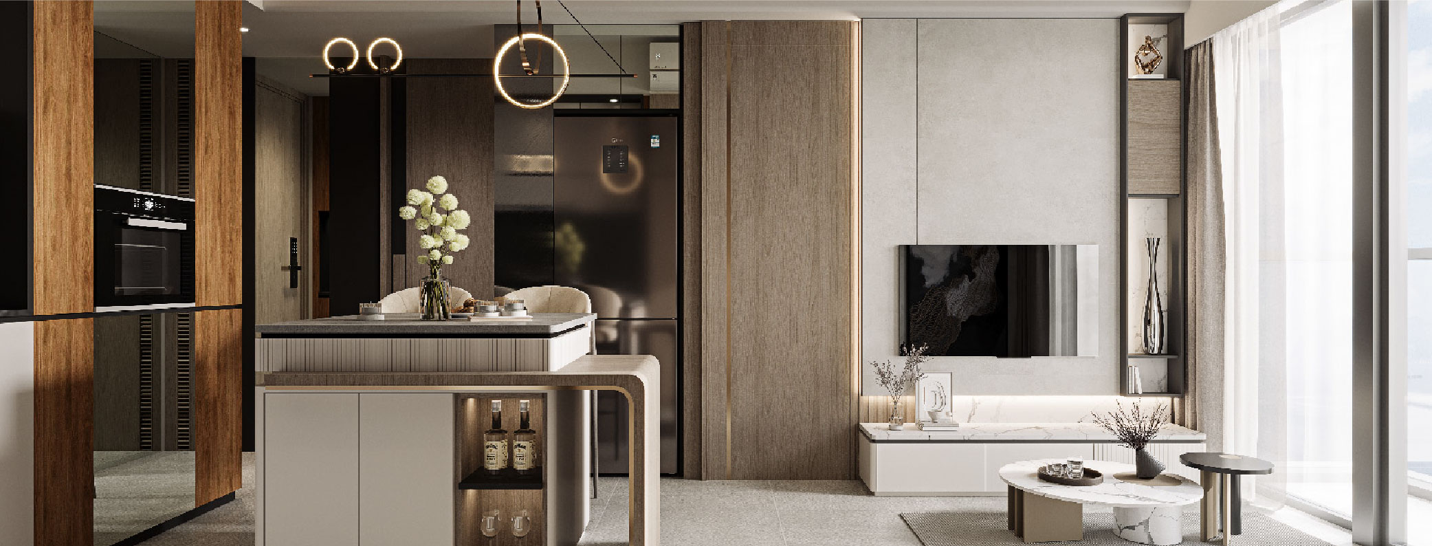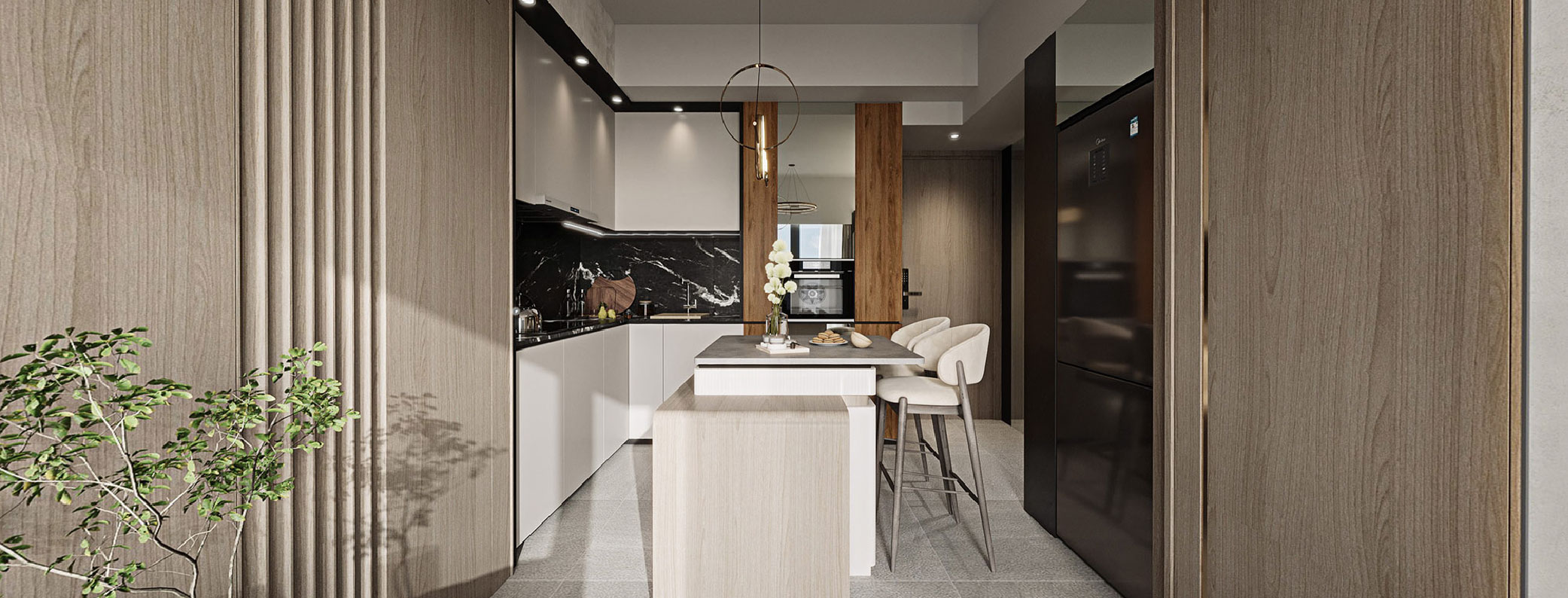 The decision to add an island table in a confined space may raise eyebrows at first glance. However, thanks to our client's trust in our vision, both parties recognise the transformative potential of integrating a central island table. A standard island table would not suffice; instead, our tasteful bespoke island table featuring a marble top, ample storage, and wine cellar elevates the space to a new level of luxury. Its presence adds a touch of sophistication, seamlessly blending the culinary and dining areas for a harmonious and stylish atmosphere.
