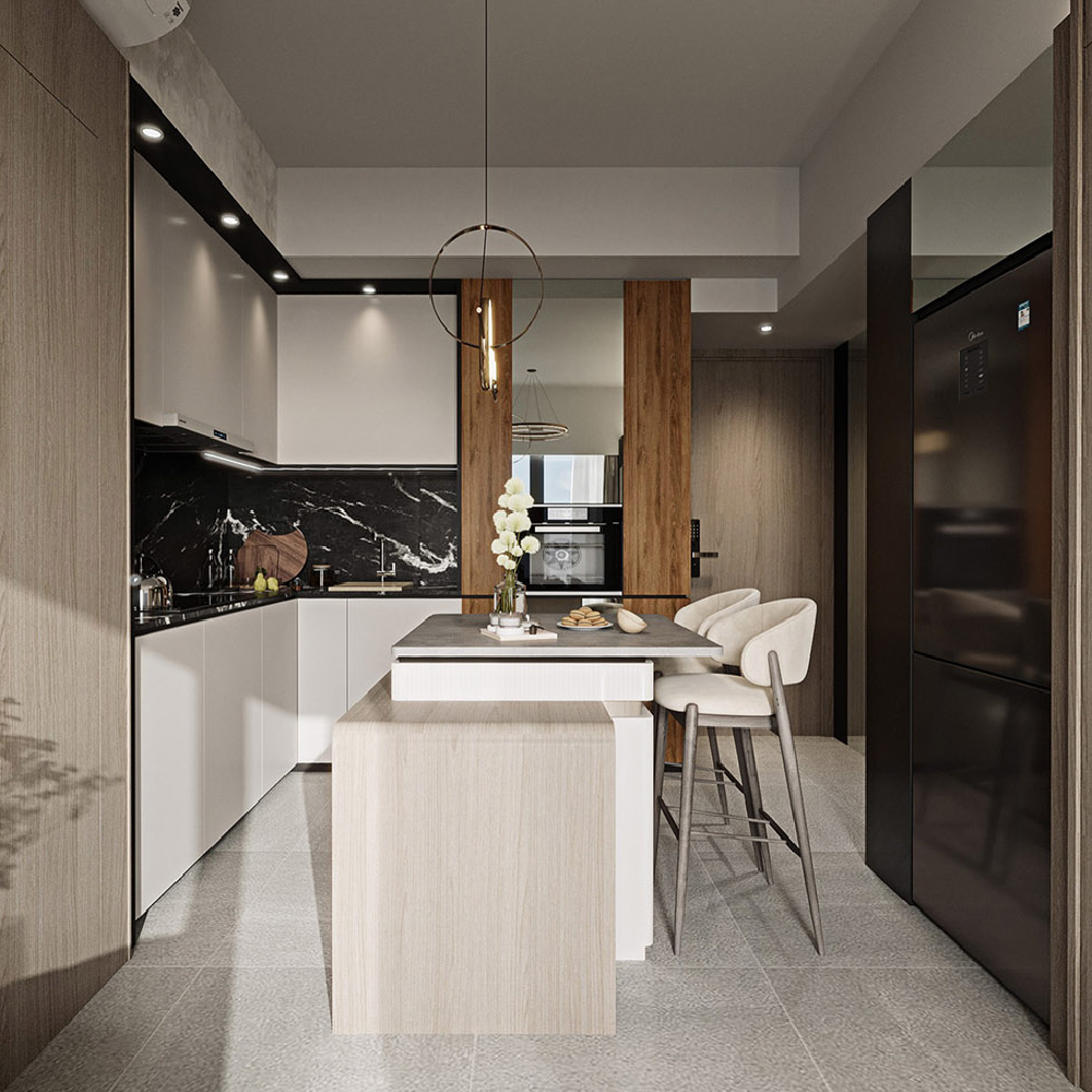The absence of a designated dining area in a limited space often leads to makeshift solutions. Homeowners may resort to using foldable tables or constantly moving traditional dining tables around, disrupting the visual flow of an open layout and lacking the cohesive interior style desired by those with a keen eye for aesthetics. In this scenario, our interior designer creatively utilises the open kitchen by incorporating an extendable island table that offers both practicality and elegance, eliminating the need for constant rearrangements.