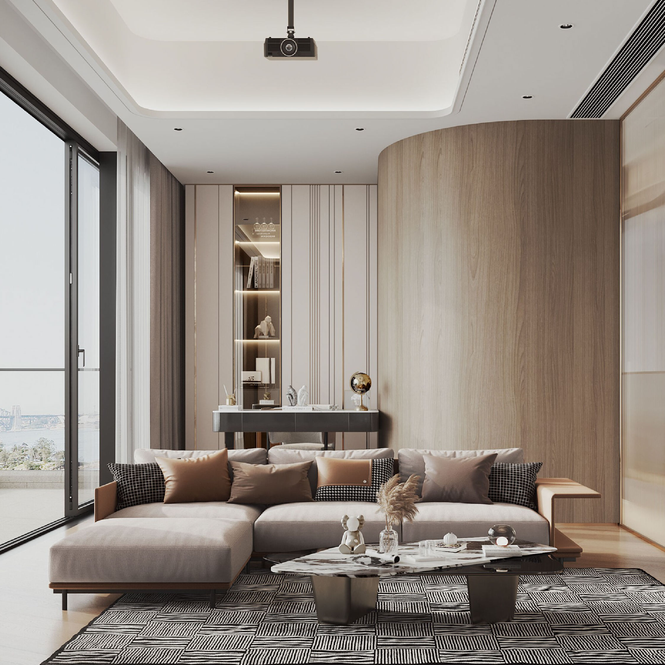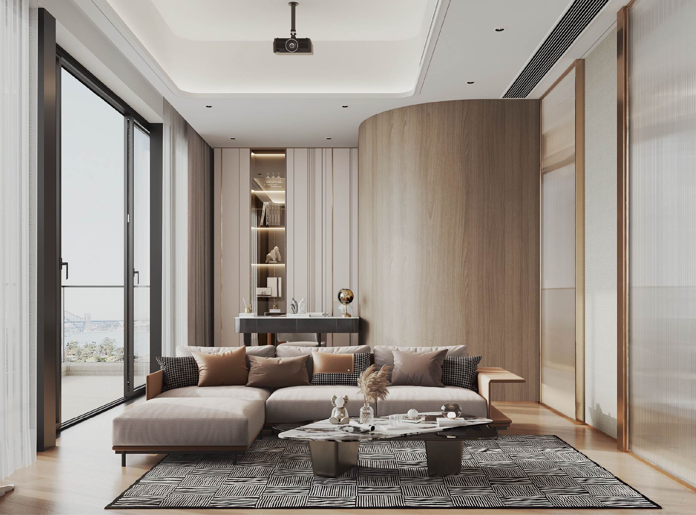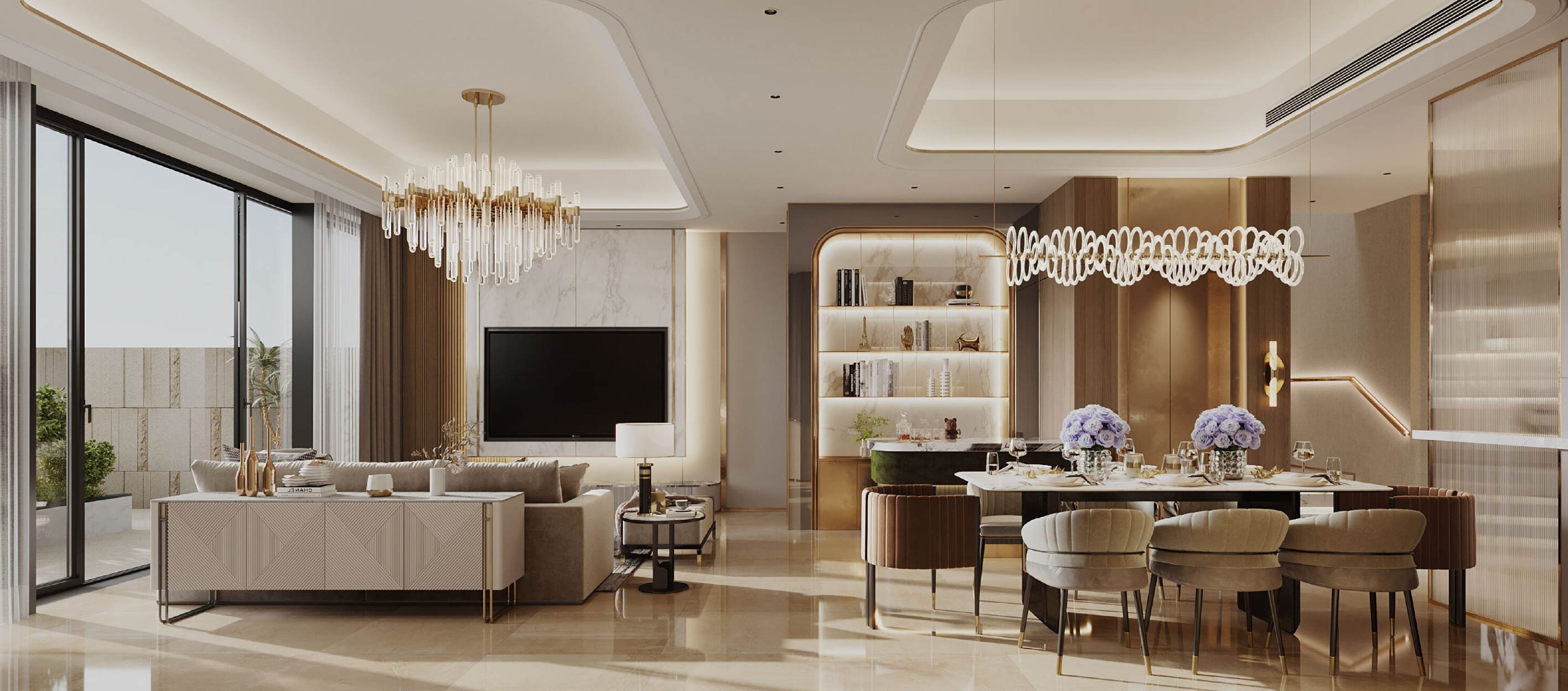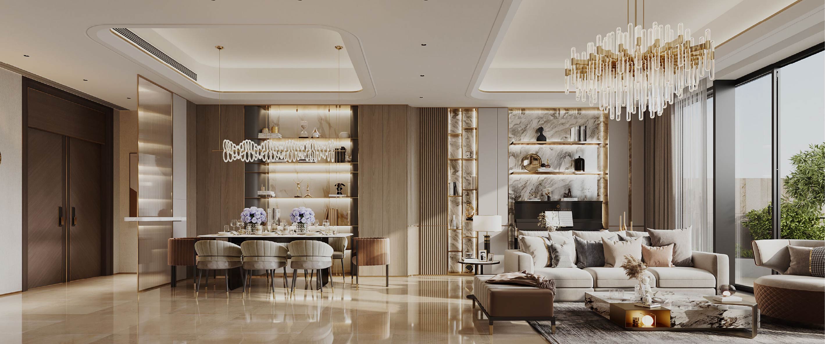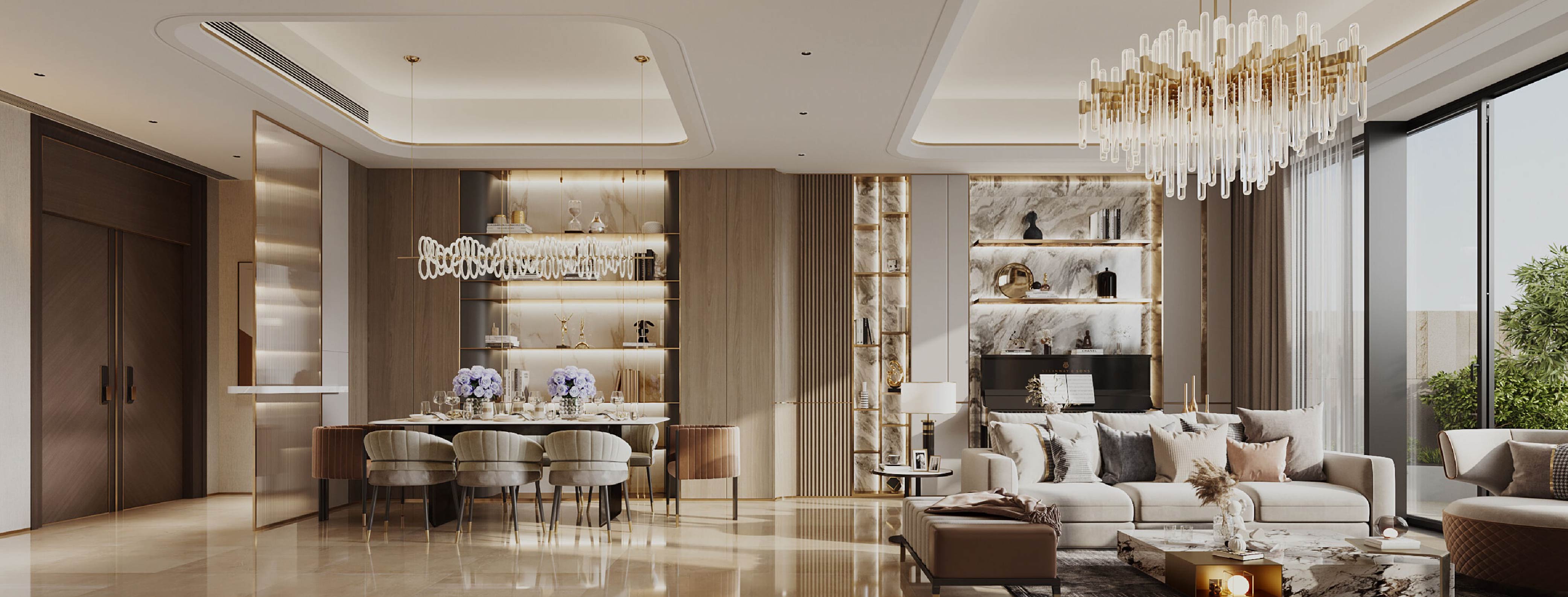 客廳和飯廳的設計概念以客戶鍾情的現代奢華風為主。中性色調佔主導地位,打造了一個舒適寧靜的背景氣氛,讓家具和設計細節的貴氣優雅得以綻放。