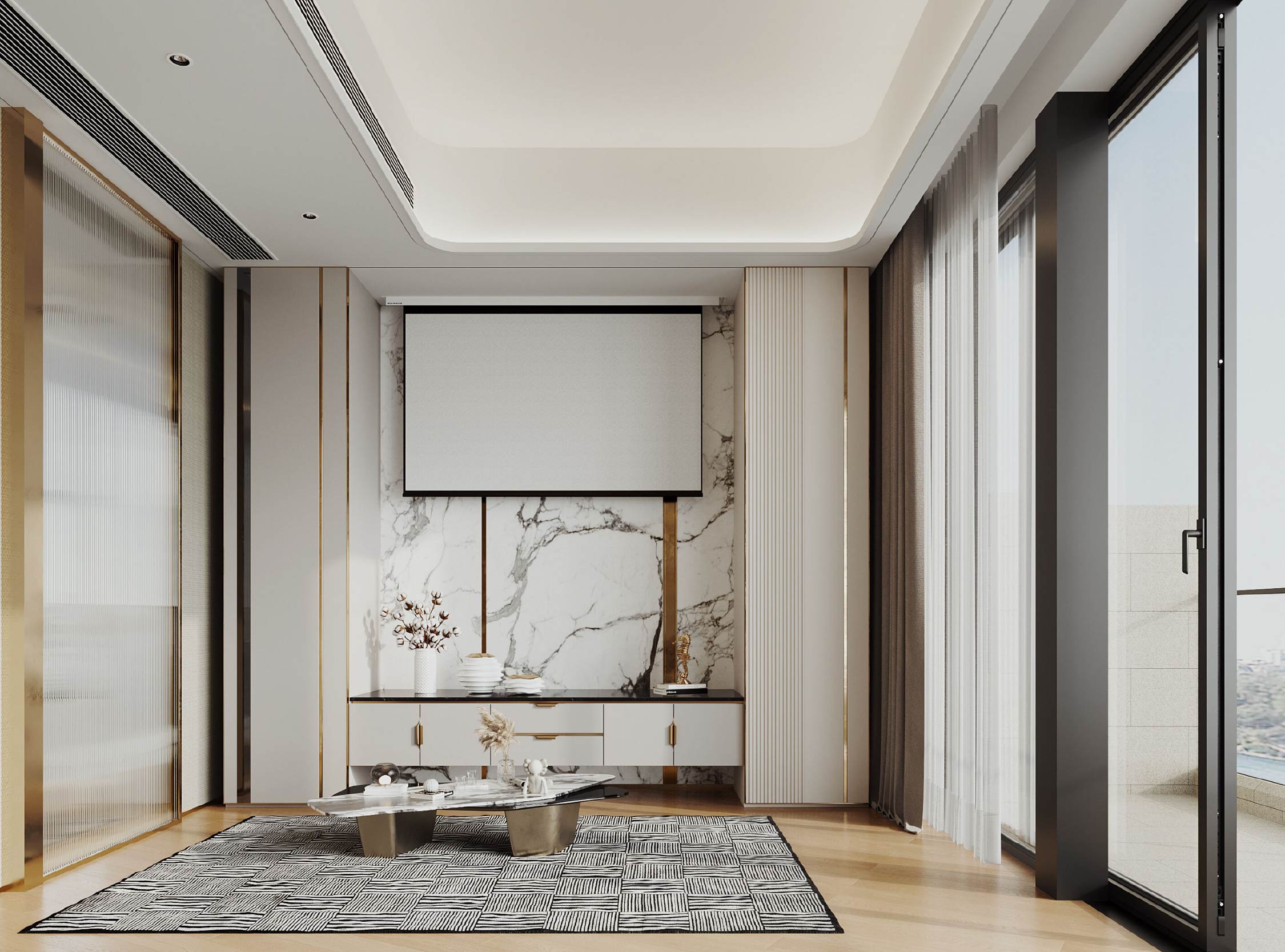 房間的牆壁以長虹玻璃面板所取代,提升空間整體美感,同時亦保留了私隱度。舒適的梳化配合奢華的大理石電視特色牆,讓氛圍更放鬆舒適,無論是與工作夥伴傾談公事或一個人靜靜沉思,都是難得的個人天地。重新規劃的空間,每一個細節都經過深思熟慮,反映了客戶獨特的品味和熱愛,為男戶主創造了一個專屬他的私人空間。