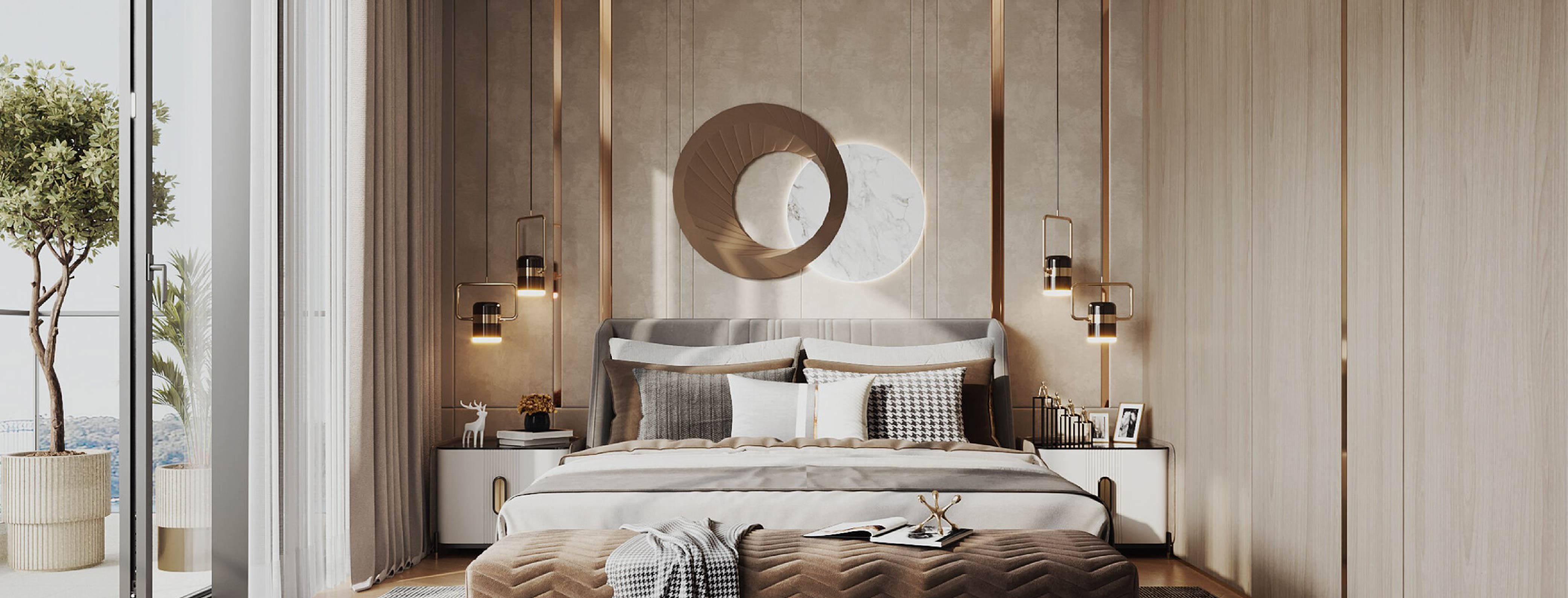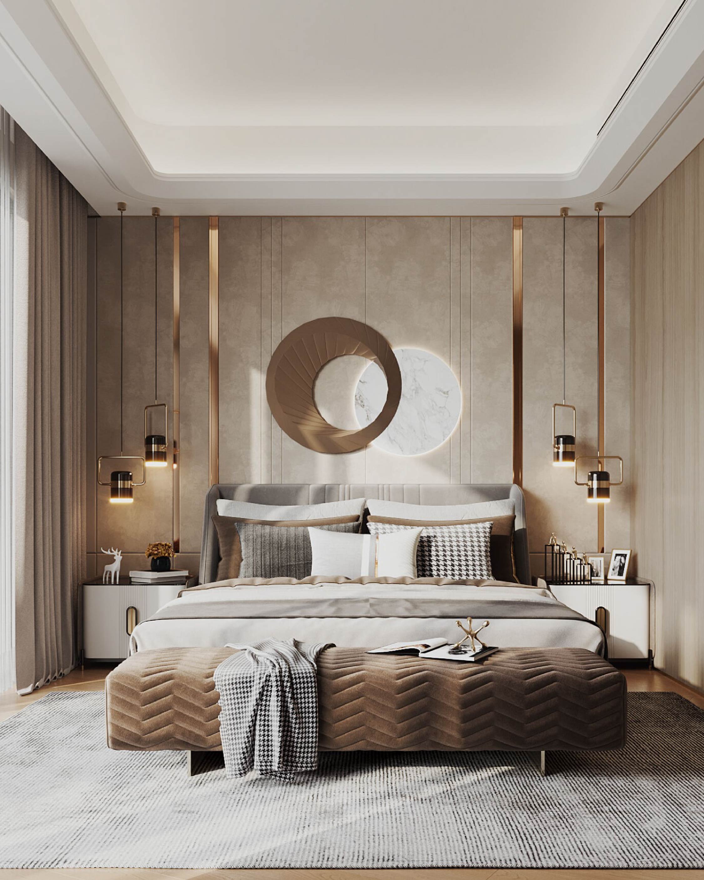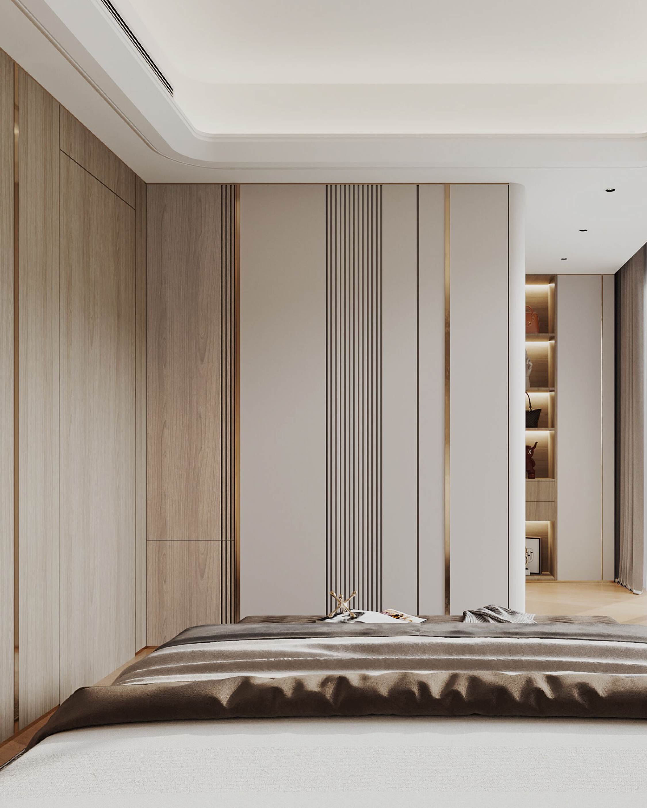 主人房以不同深淺的啡色和黃銅金屬作配搭,巧緻典雅。豐富的巧克力色與木質板材完美配合,營造出温婉且迷人的魅力。乾淨的線條和簡約設計訂製傢俬顯得睡房大方利落,而黃銅色金線則為空間增添了一絲雍容華麗。