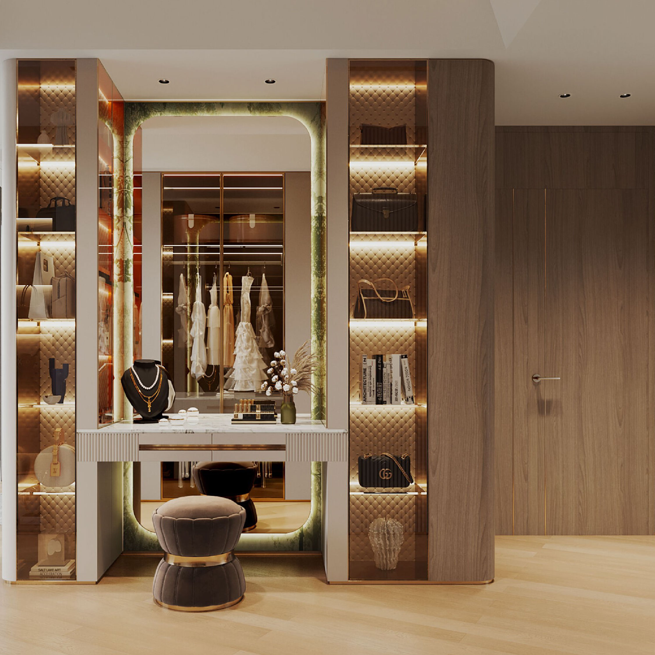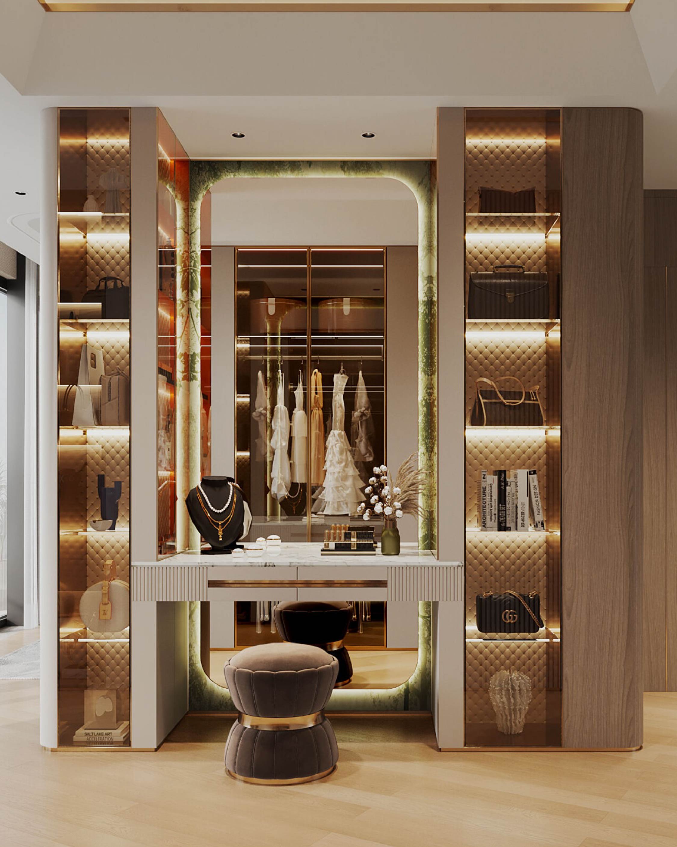 睡眠區設計低調,突顯了步入式衣帽間的奢華和尊貴,以及一系列貼心細節。優雅氛圍滿溢的衣帽間,牆上設置了整齊的訂製層架與櫃子,可整潔有序地展示出女主人各種鍾愛的衣物、鞋子和配飾等。梳妝台旁邊設有全身鏡子,提供了一個舒適換裝區,方便女主人隨時隨心梳妝打扮。貼心的設計又豈止如此?大理石製的珠寶手飾櫃檯和內置手袋層架,讓女主人肆意展示華麗精緻的手飾、手袋,增添高雅華貴之感。