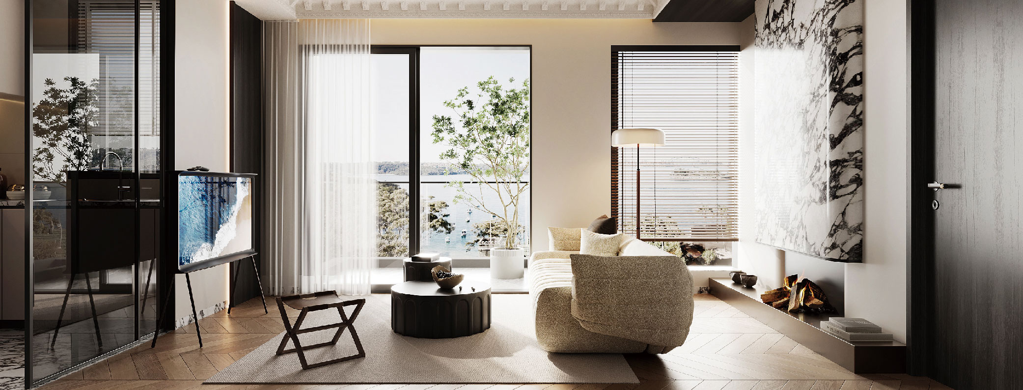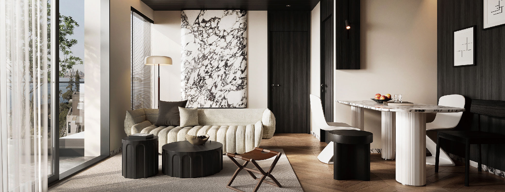全屋以黑白色調為主軸,Eric特別挑選了簡約線條與對比色彩的軟裝來緊扣主題。設計師巧妙地引入包圍Koko Mare自然光景中的豐富陽光,以此打破單色調可能帶來的冷漠感。讓自然光成為平衡採光的媒介,確保空間向訪客和戶主呈現溫煦包容的氛圍。溫暖色調的木質地板不僅增添了一絲舒適,還提升了整個客廳的暖意,打造悠揚氣息。