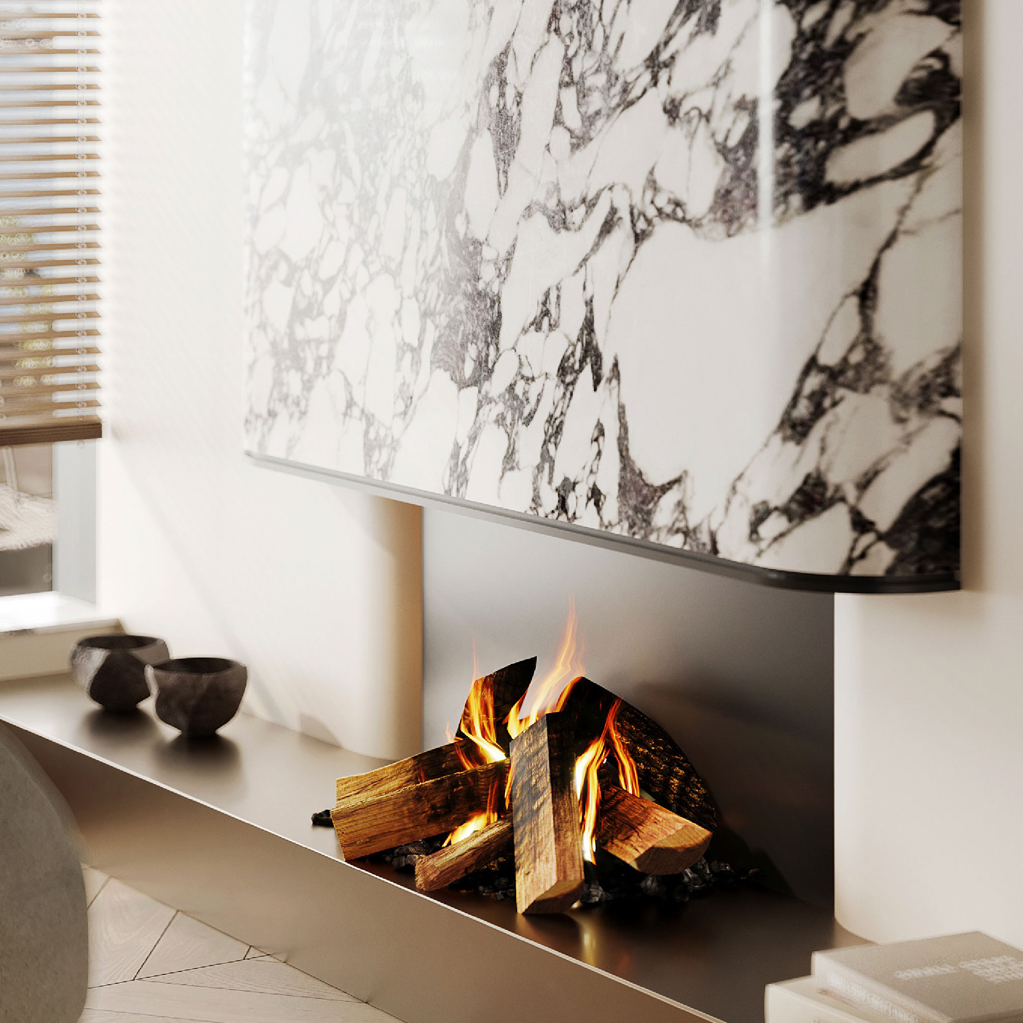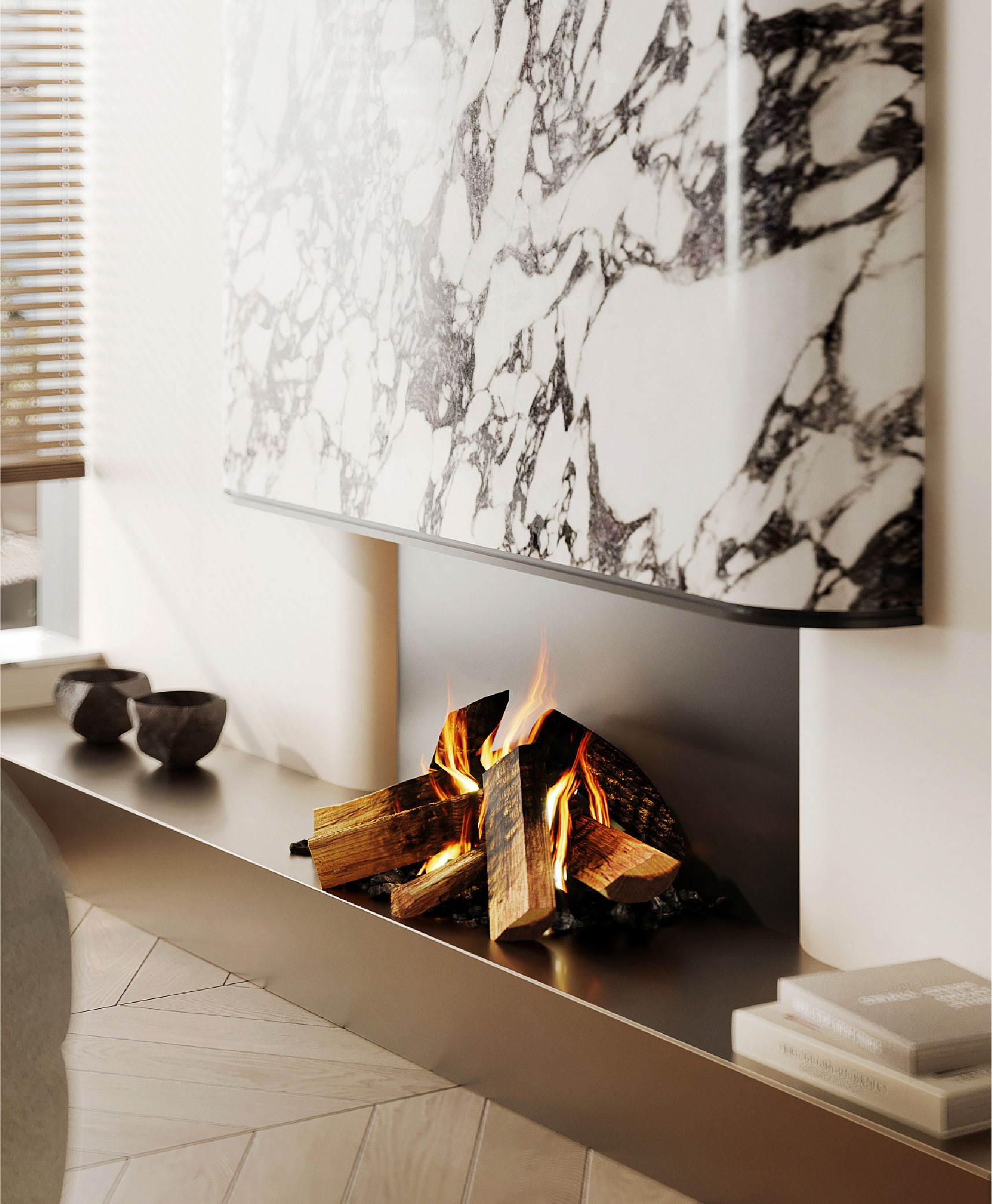 在精挑細選的時尚家具之上,客廳梳化背後的大型雲石紋弧形特色牆,打破常規成為焦點。更為可貴的是這個設計亮點是一件具有實際功能的藝術品,華麗的牆身內嵌可散發和煦光彩及加濕的火爐霧化燈。仿真的溫暖火光編織出舒適愜意的氛圍,將這個客廳轉化為一個可以放鬆身心、激發創意靈感的理想空間。