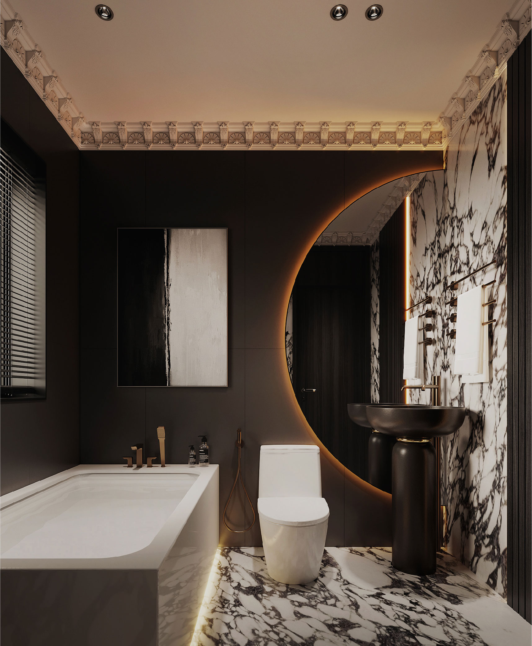 極具情調的精緻感徐徐環繞在這個深邃且極簡的洗浴室當中。在沉實的色調中,雲石牆身和地板為空間提供了簡約而尊貴的基調。另外,天花上的花線貫徹整體的優雅風格,確保了過渡的平滑與和諧。