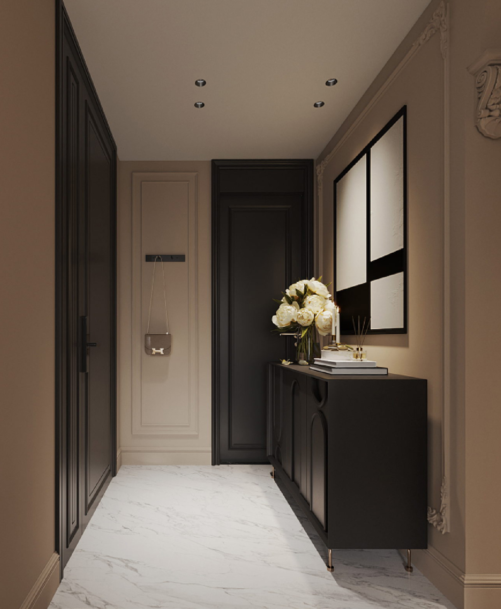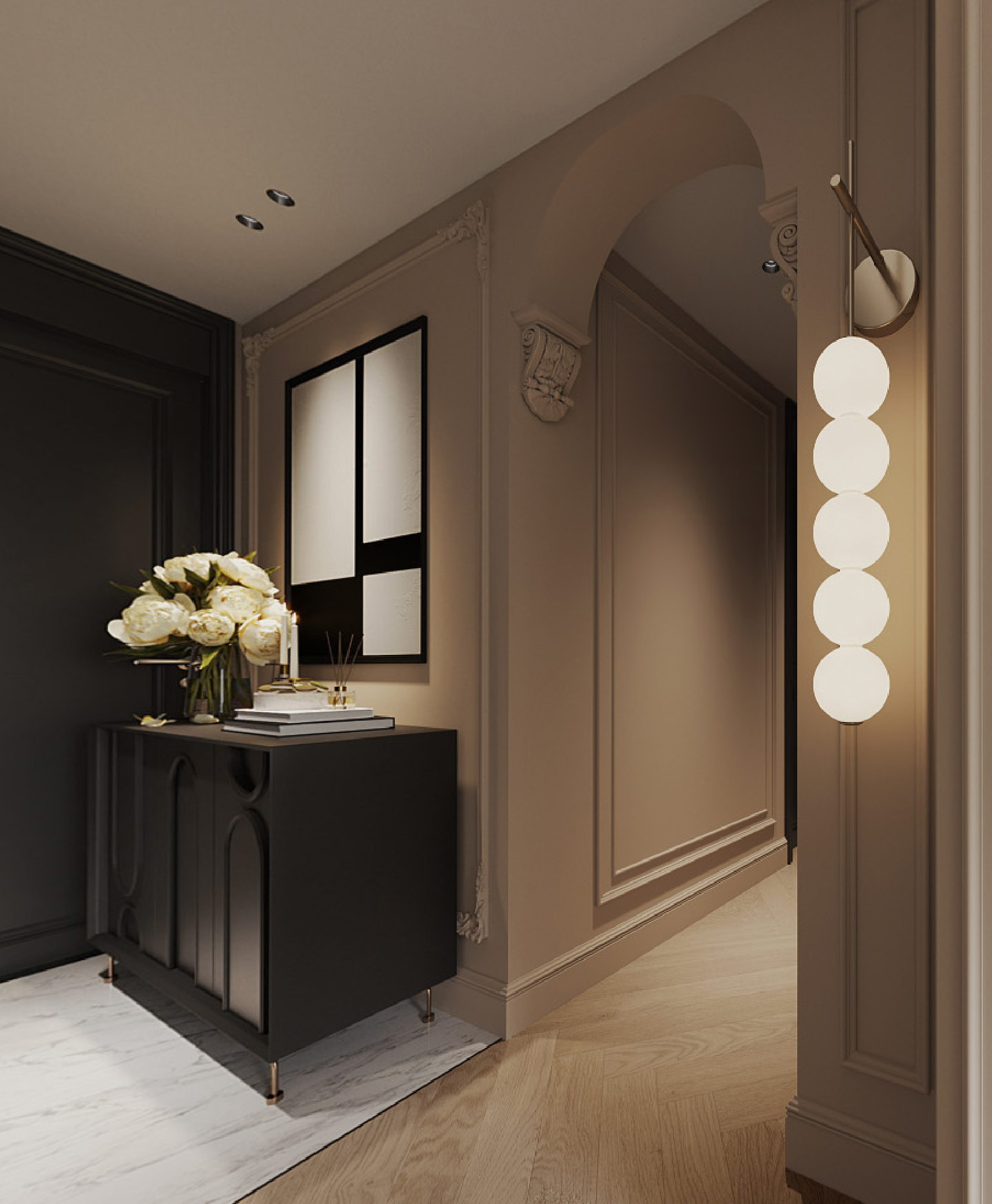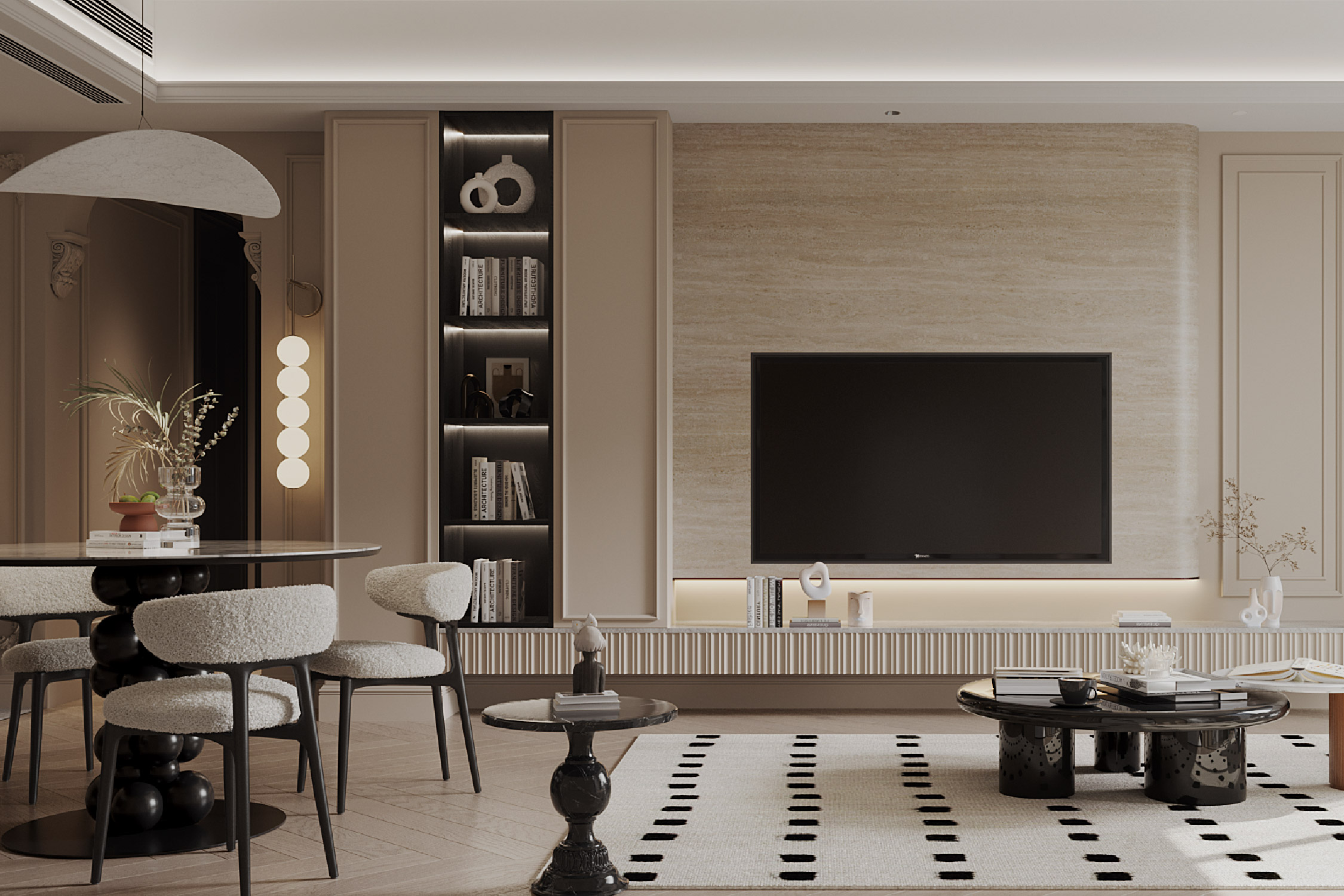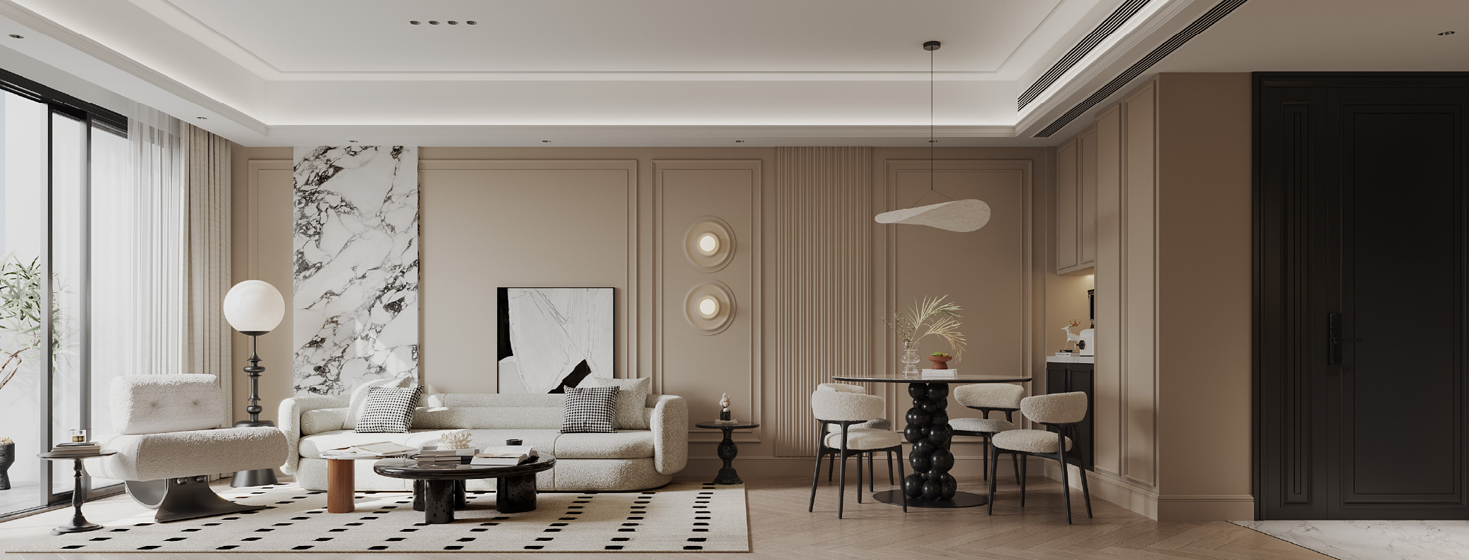 這個天瀧單位的玄關優雅精緻,將現代時尚與古典奢華和諧地結合在一起。花型雕刻花線點綴入口迎面的牆面,營造出一種精緻氛圍,在其前面則是兼具實用性和美觀性的鞋櫃。創新的設計將廚房門隱藏,黑色花線牆板與相鄰的灰調米牆板完美平衡,增加了空間的深度和視覺趣味。下方的白雲石地板,將玄關與客廳區域劃分開來,散發出奢華的氣息。這一系列經過深思熟慮的設計細節,向訪客訴說著這不只是現代歐洲風格的空間,而是一個活力之都的居所。