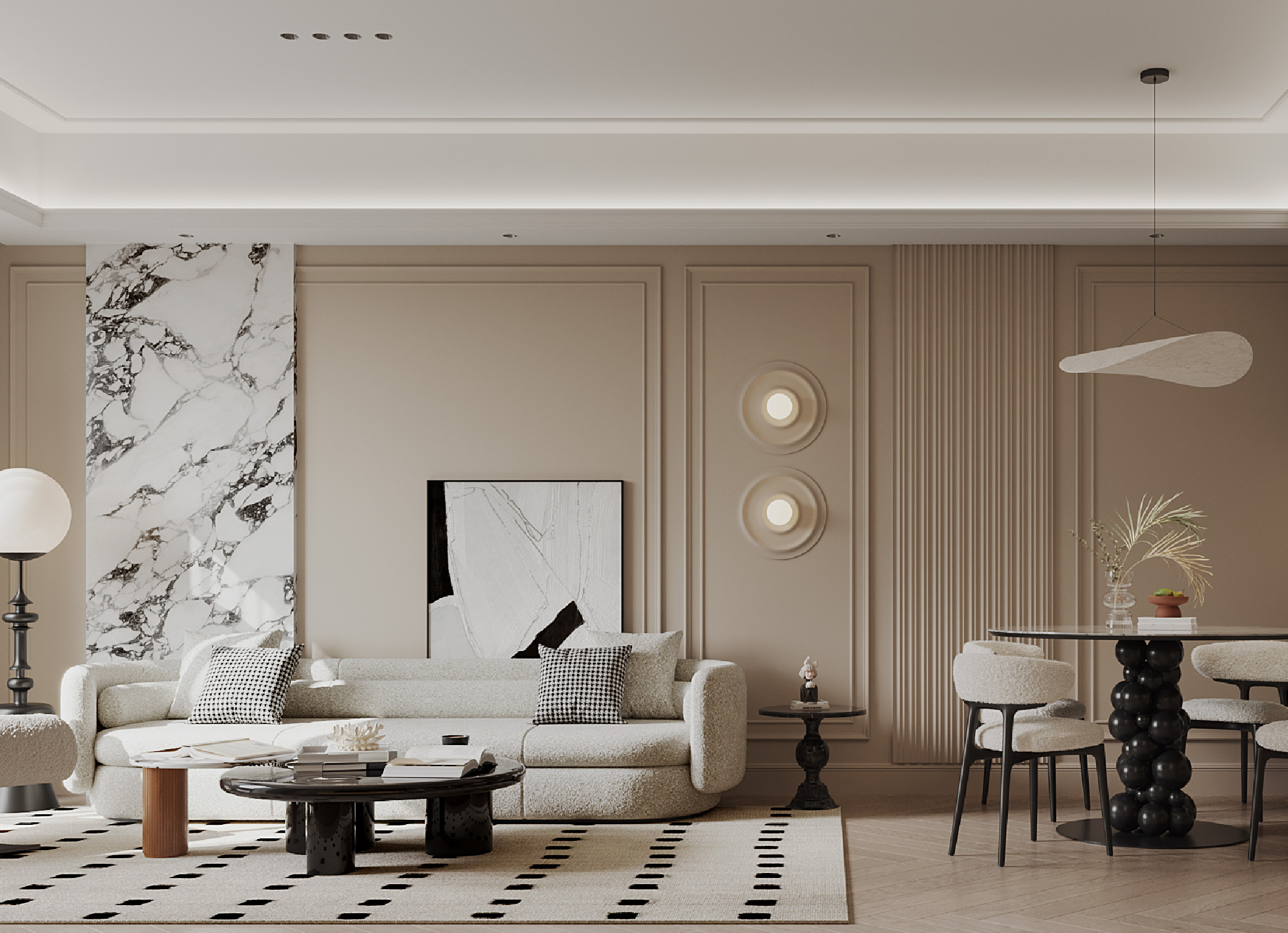 電視牆對面則是另一焦點傑作,沙發後方的一面大花白雲石牆,鋪展在花線牆上,延伸處是兩盞嵌在圓框內的圓形壁燈及條子牆面,構成一幅橫跨客廳與飯廳的獨特牆身,大大增加了空間的吸引力,同時微妙地創造出了視覺上的區域分界,引導人們優雅地走向由條子牆面為起點的的飯廳。