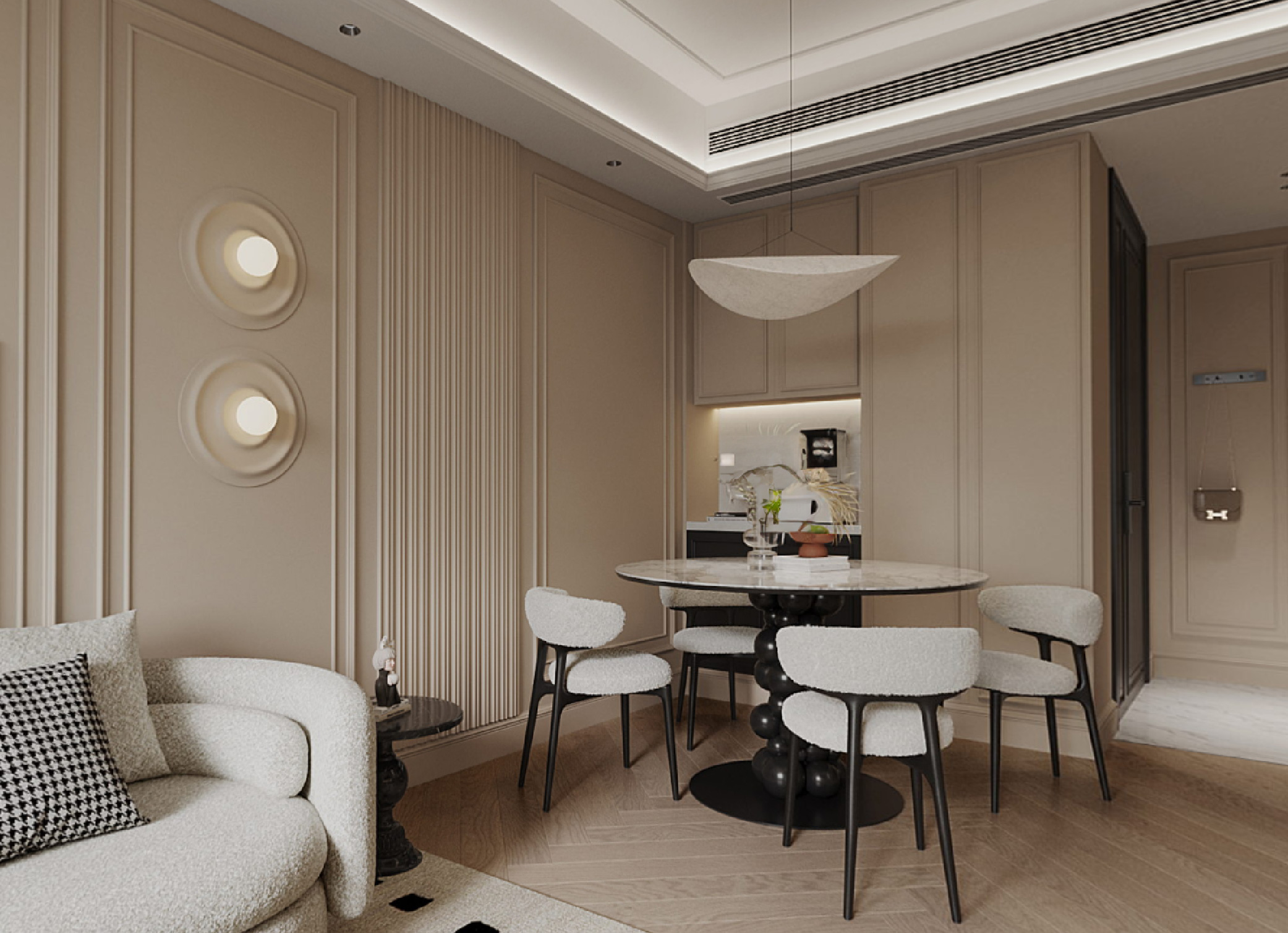 在訂製傢俬與耐看色調的統一設計下,客飯廳無縫融合,細膩的花線優雅地裝裱著牆面、櫃門及房門,散發出低調的精緻氣息。