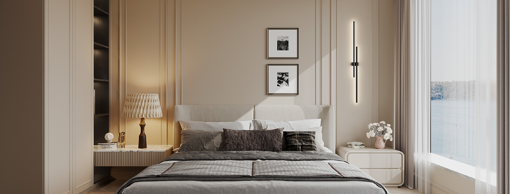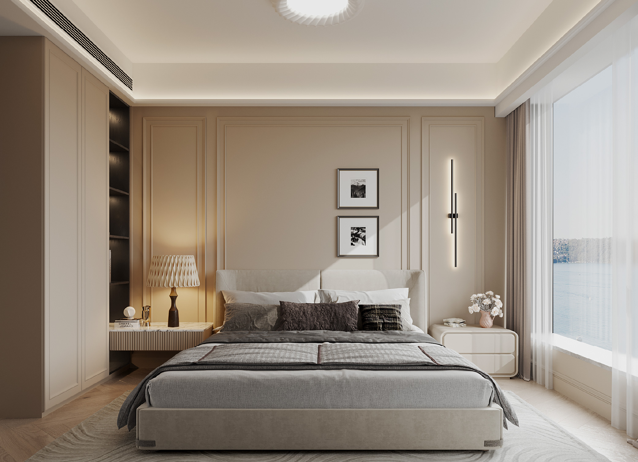 擁有了專門收納的衣物空間,現在睡眠區域可安排得更為簡潔寧靜。可三面下床的加大雙人床兩側配置了床頭櫃,成為空間中心點。床旁是一個帶有部份展示架的衣櫃組合,可供戶主展示珍藏,與廣闊的海景相映成趣,打造出一個寧靜且低調奢華的港灣。