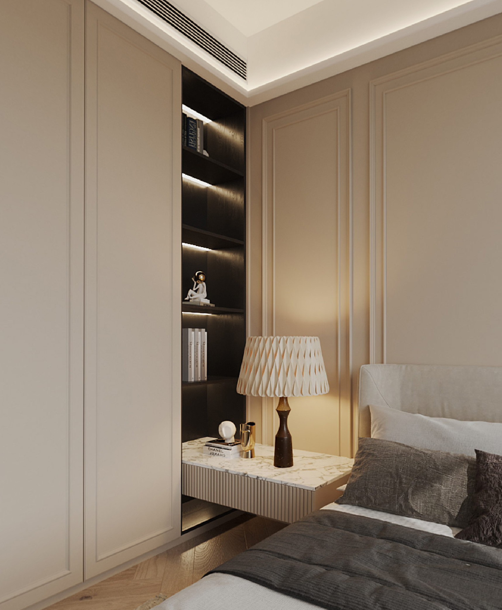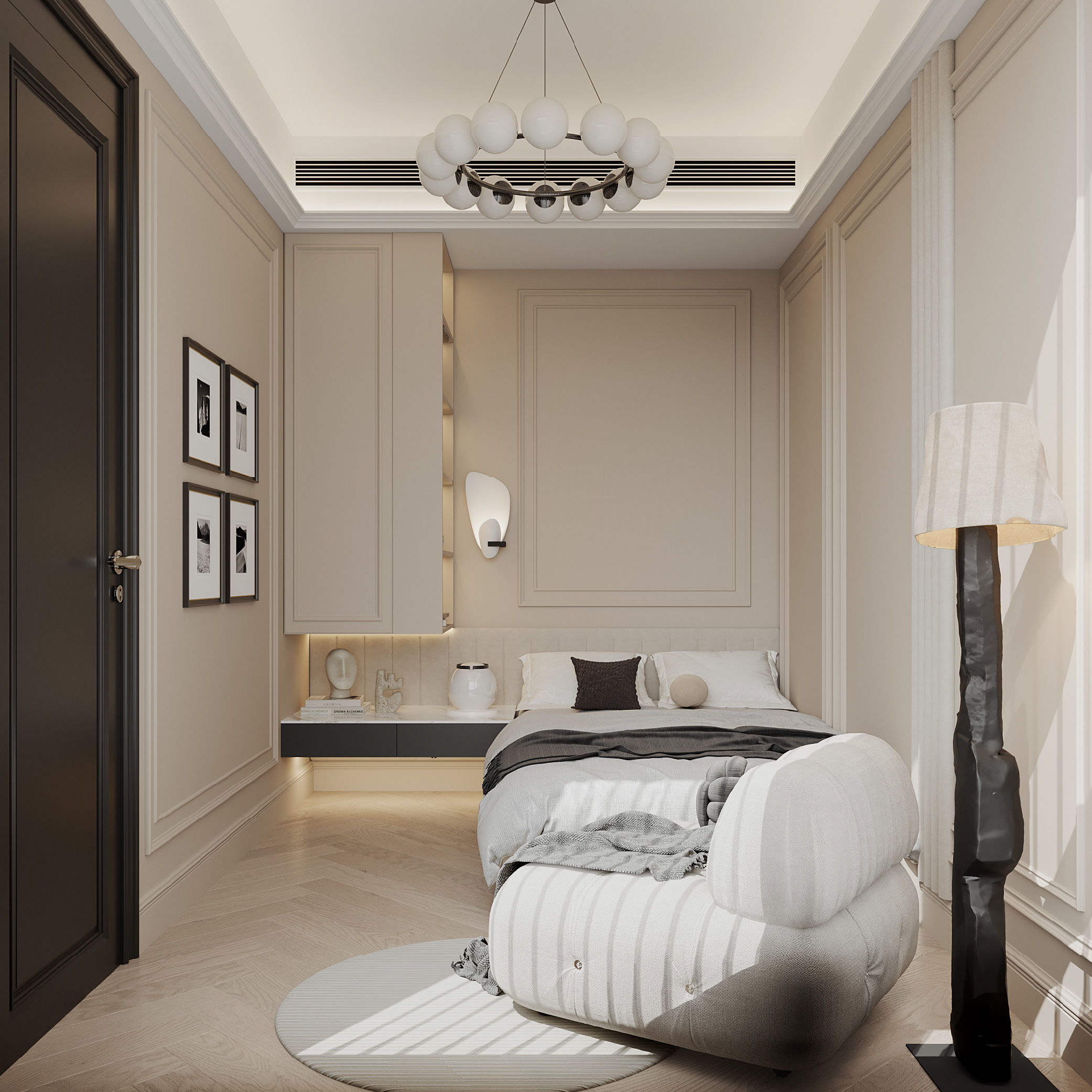 沿襲了整個住宅統一的高雅色調和現代歐洲主題,客房為偶爾來訪的客人提供了一個誘人安睡的休憩角落。推開房門,似乎能感受到一股溫暖的氣息。花線環繞此間,從床頭延伸至儲物組件,精緻的牆飾猶如絨毯般擁抱四周,散發著設計巧思。床邊的小空間設置成美觀而實用的儲物區域,包含了小衣櫥、書架和懸浮床頭櫃,為短期留宿者提供充足的儲存空間。為讓這房間更具特色亮點,設計師在牆身加入了一幅一呎寬的軟包條子布藝牆板,顏色與牆面匹配,賦予空間溫暖與細膩的觸感。