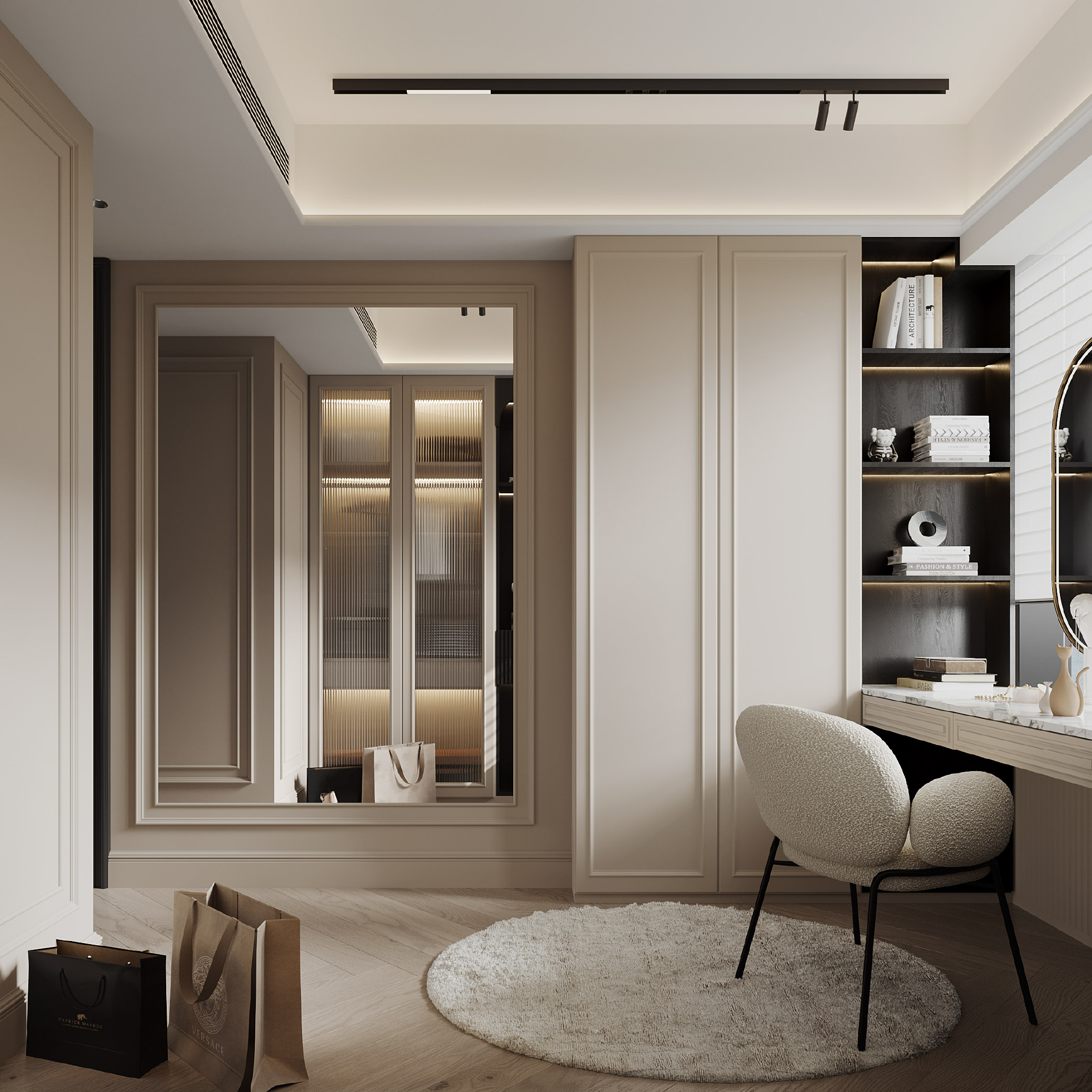 步入式衣帽間進一步加強了這個奢華空間的功能性,其U型訂製傢俬設計方案,一張精緻的梳妝台優雅地置於櫃子之間,以及可用來展示名貴手袋和收藏品的展示架,為用家提供了合乎日常需求的功能。設計師特意加入了弧形元素,例如是展示櫃頂的拱形框架和懸掛式橢圓梳妝鏡,而架子和衣櫃中的LED燈帶也散發出迷人柔光,點點的柔和感為空間增添特色。在美學與功能性的和諧融合下,日常生活空間變得更不凡。
