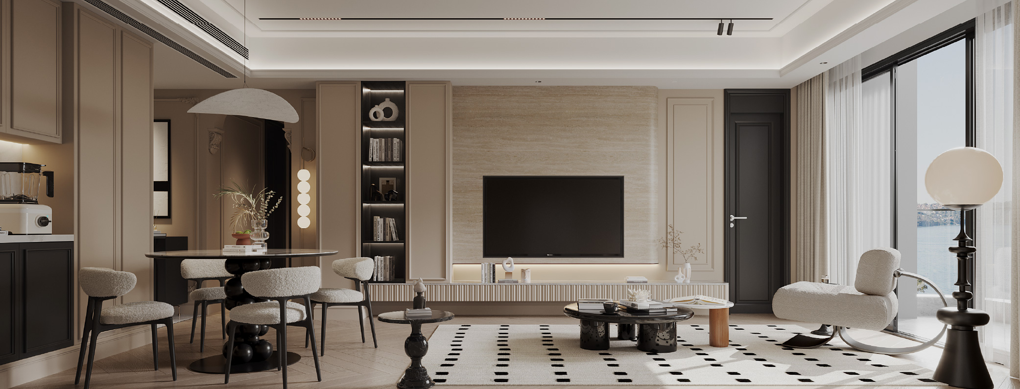步入客廳區,會經過一道具維多利亞式元素的拱形廊門,高貴感悠然而生,賦予空間經典的魅力。與其此相輔相成的是一盞由四個球體狀的吊燈,投射出柔和光線,溫暖地歡迎住戶步入私密的休息區域。繼續移步入內,會看到左側包含儲物及展示功能的一體電視牆。這面牆以一大片米色洞石板為空間引入柔和的色調與和自然紋理,帶來溫暖舒適的感覺。電視牆尾端的設計也值得注意,客房入口間色調強烈對比的設計,與玄關互相呼應,加強了設計連貫度。